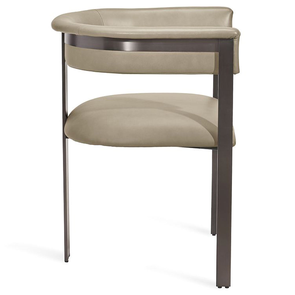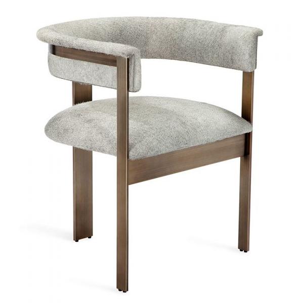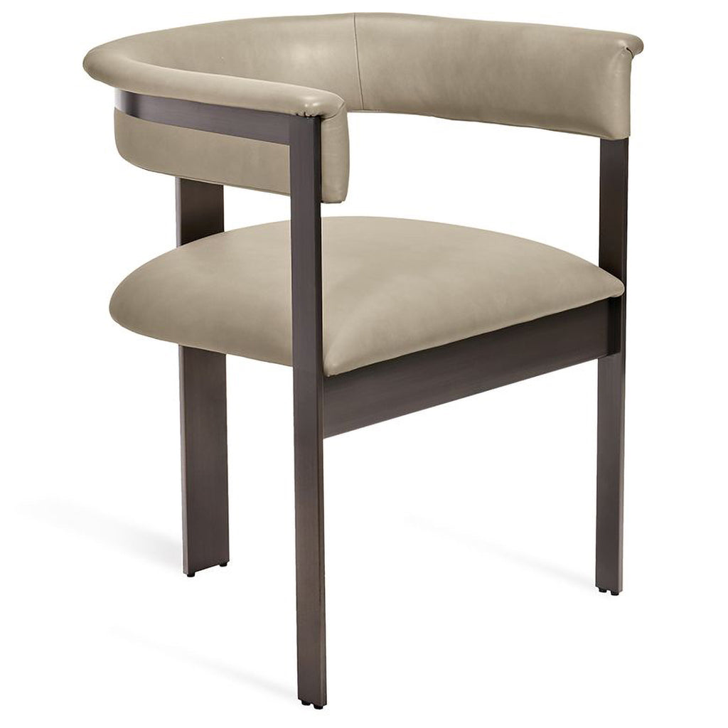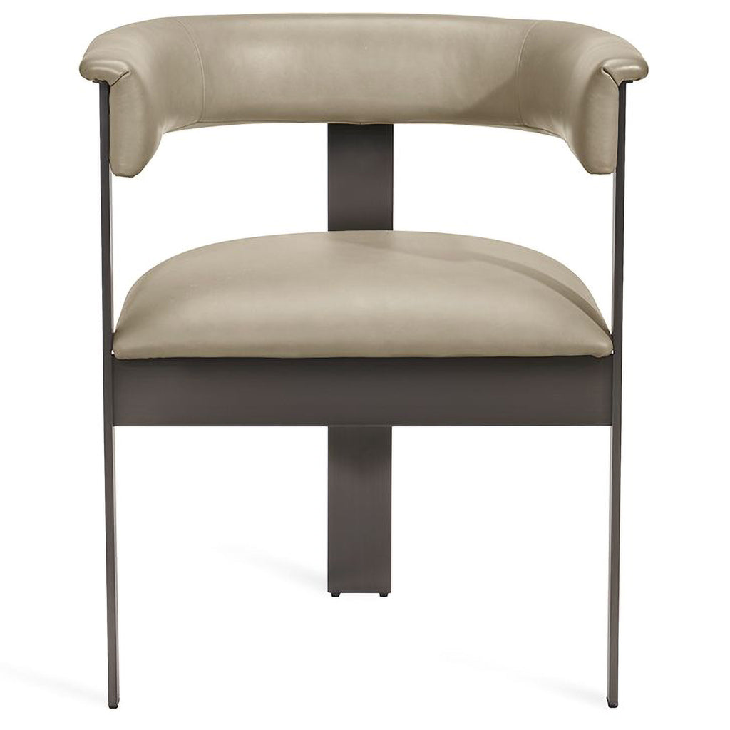 Interlude Home's worldly style brings what's now and next to the home with high fashion designed for everyday function. Boasting an art moderne influence, the Darcy Dining Chair features a cream leather, taupe leather, gray leather or natural gray hide seat and a streamlined stainless steel frame in a shiny brass, polished nickel or antique bronze finish.