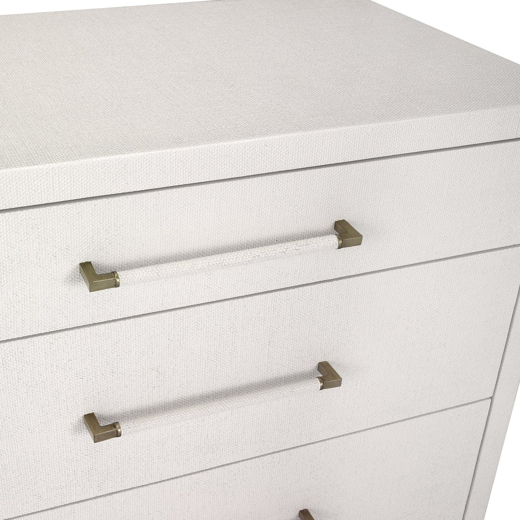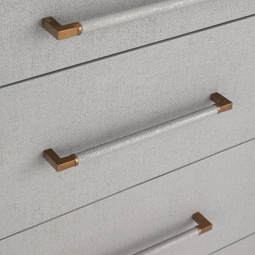 Interlude Home's worldly style brings what's now and next to the home with high fashion designed for everyday function. The clean lines of the Taylor 8 Drawer Chest are transformed into a statement piece thanks to the texture of light gray or natural white faux linen and metal pulls in antique brass or champagne silver.