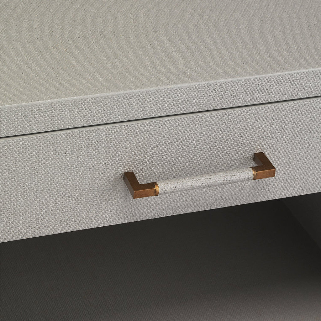Interlude Home's worldly style brings what's now and next to the home with high fashion designed for everyday function. The clean lines of the Taylor Bedside Chest are transformed into a statement piece thanks to the texture of light gray o and metal pulls in antique brass.