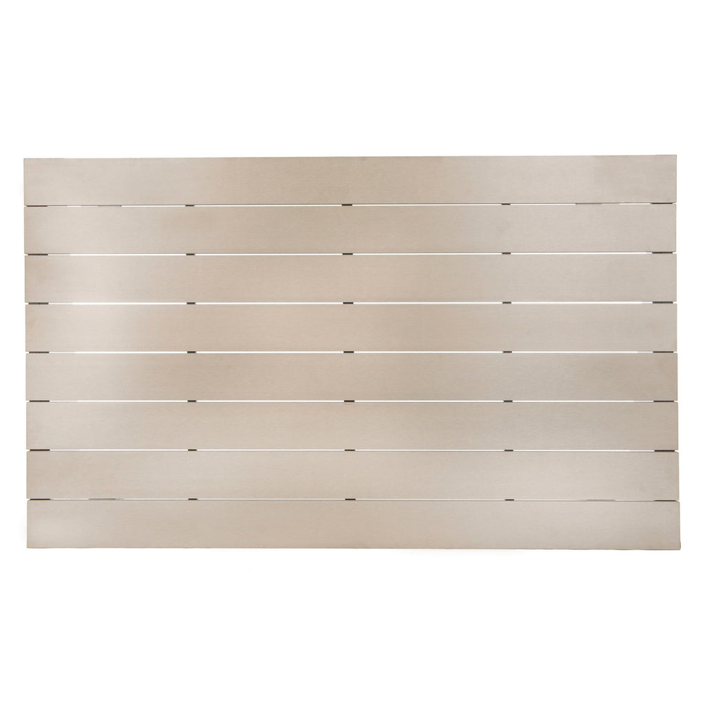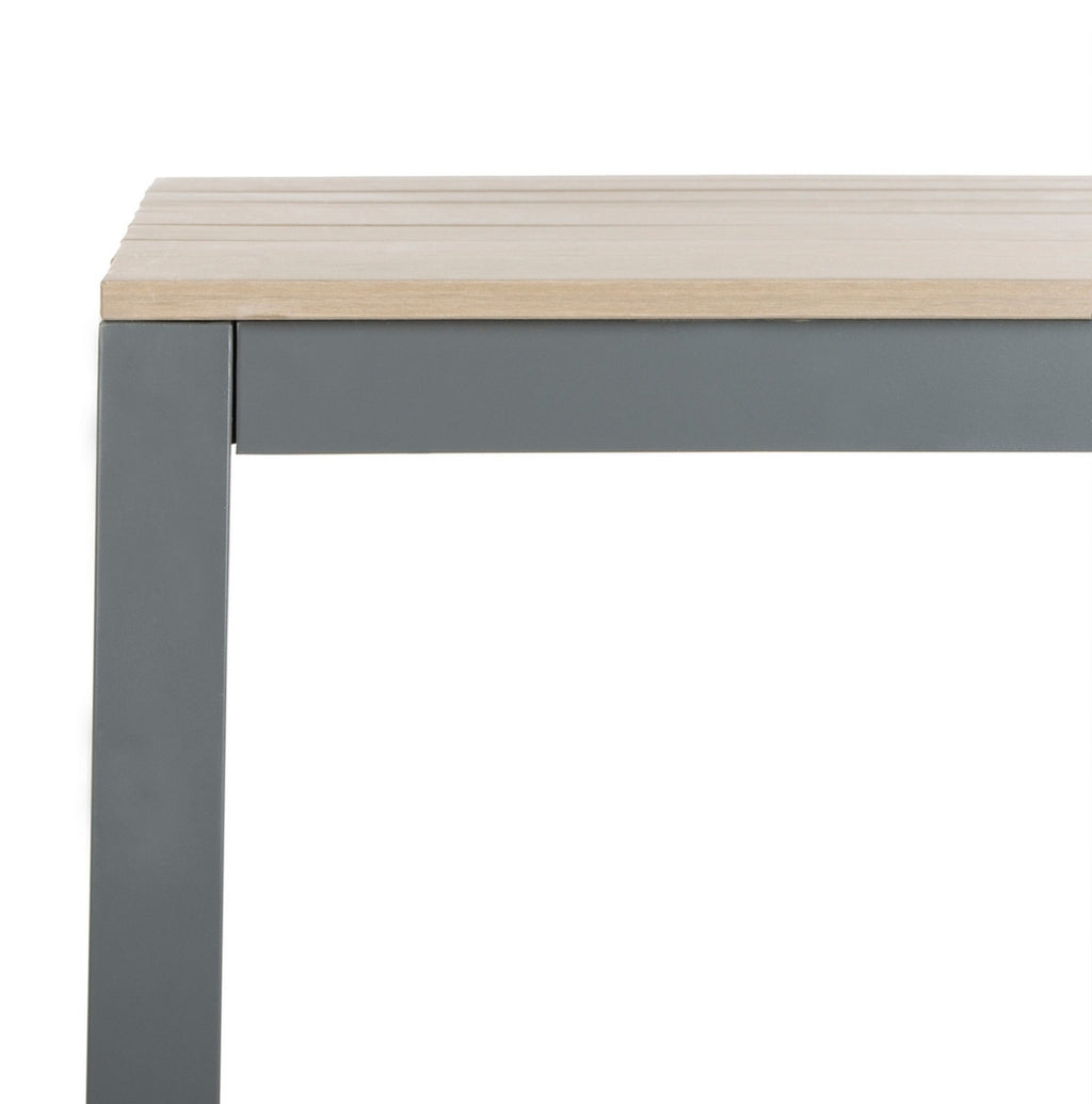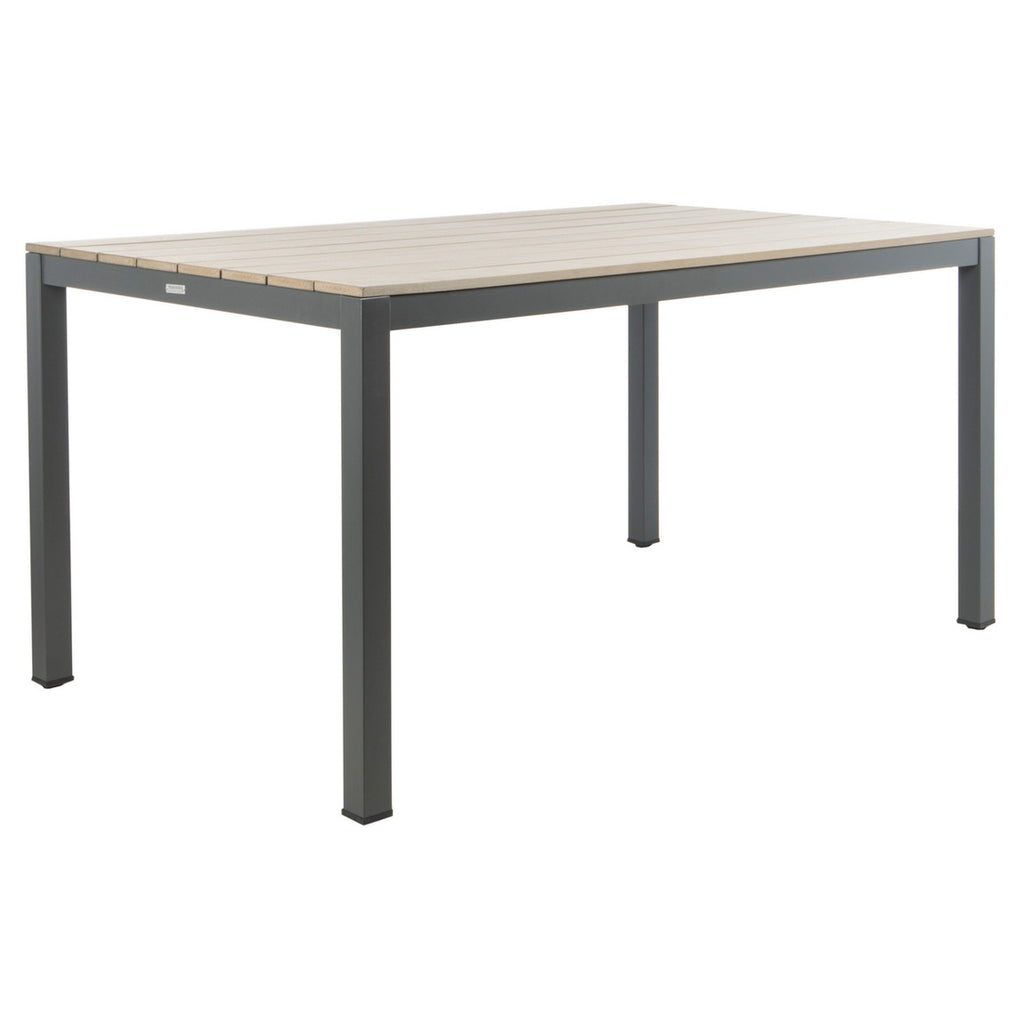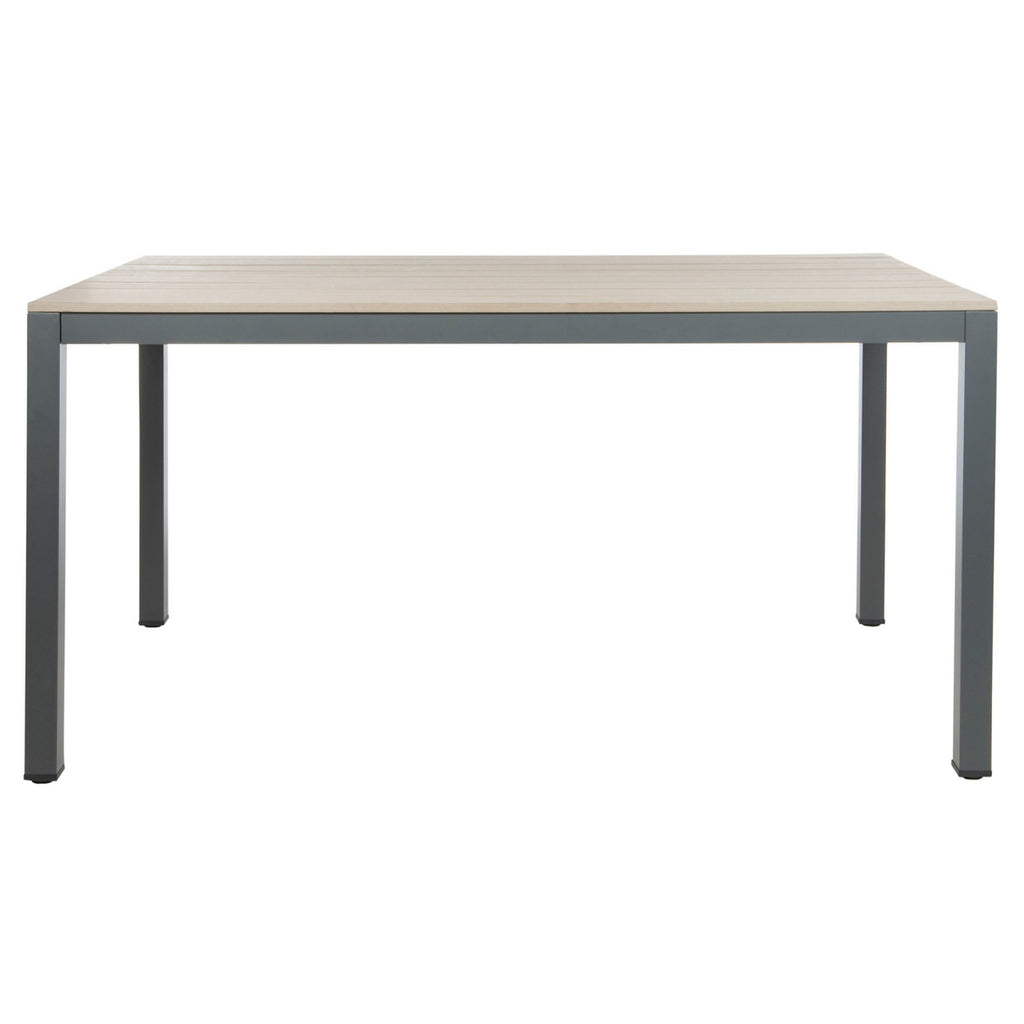 Bring minimalism to your outdoor decor with this smart and stylish dining table. Its Grey frame and Distressed Taupe wood panels create a neutral palette, while its clean lines make it a perfect in any transitional outdoor entertaining space.