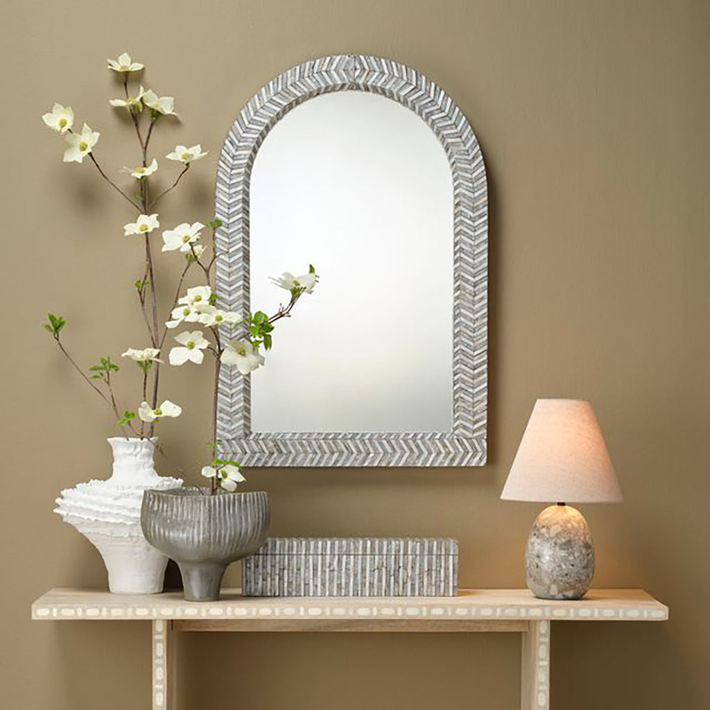 Mother of Pearl is a naturally iridescent jewel of the sea. The substance has a rich luminescence, and each piece of it is unique. The frames of these magnificent mirrors are adorned with mosaics created from small strips of this material. Our expert artisans place each piece by hand resulting in true works of art. These mirrors make an inspired addition to a gallery wall or hanging in an entryway or powder room for an upscale, casual, comfortable look you will love to come home to.