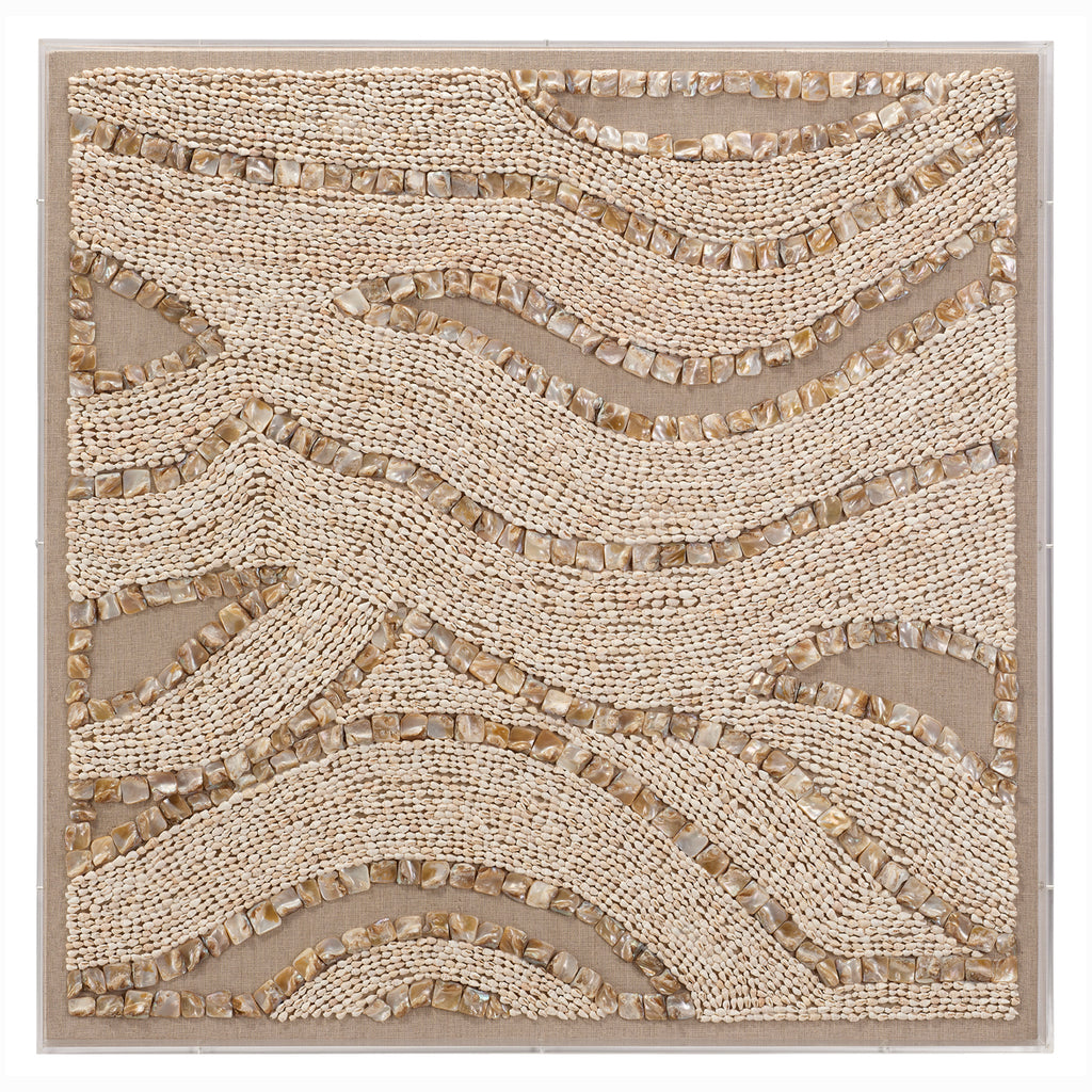 This wall art was inspired by the crashing waves of the ocean, and the curving strings of nassa shells and larger shell fragments are meant to suggest this movement. The natural variation in texture and shape of the seashells gives the impression of rippling water, and the linen backing peeking through from behind suggests a sandy seashore. The attention to detail is staggering, making this wall art a stunning statement piece for any room. Handcrafted with thousands of tiny shells, each piece is a unique work of art.