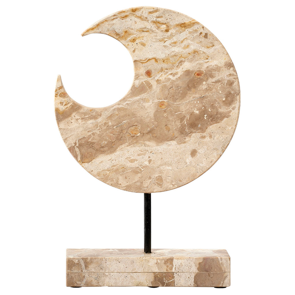 This dramatic sculpture uses cream colored marble to reflect and respect the beauty of celestial objects. The intrinsic veining and shading of the natural stone nods to the rocky formations of our constant companions in the sky. They are sized to make a strong visual impact, and are a wonderful way to add height to any tabletop display. No two will be identical.