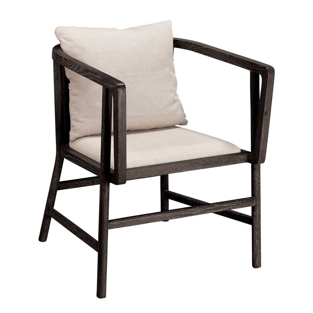 The classically modern Jamie Young Grayson arm chair with a driftwood grey washed finish and an off white linen upholstery.