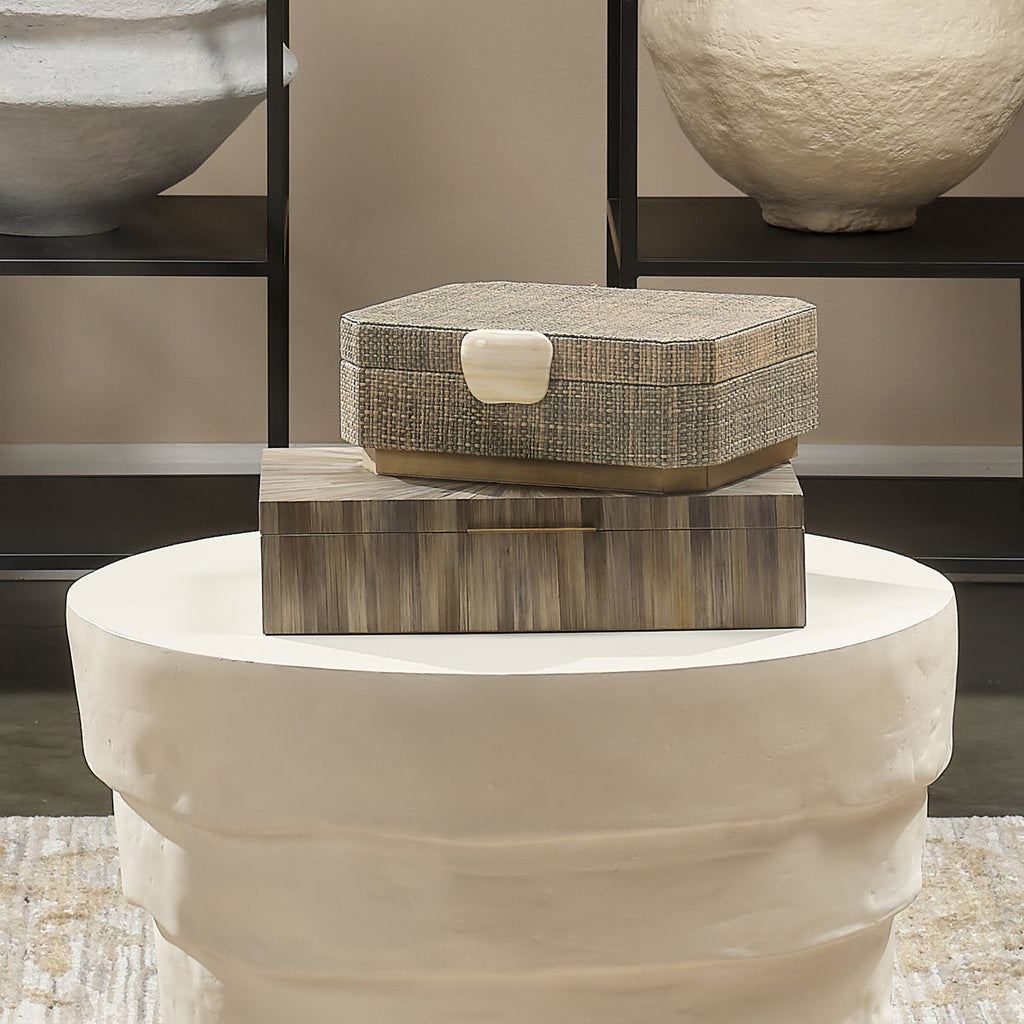 Artisans create the exuberant starbursts on these boxes from thin strips of straw in variegated natural tones. Each opens easily on a quadrant hinge to reveal a generous interior lined with chambray fabric. Underneath is a brown suede lining. With its lux interpretation of mid-century design and its decidedly tropical aesthetic, this is refined storage worthy of any treasure that needs to be stylishly stashed.