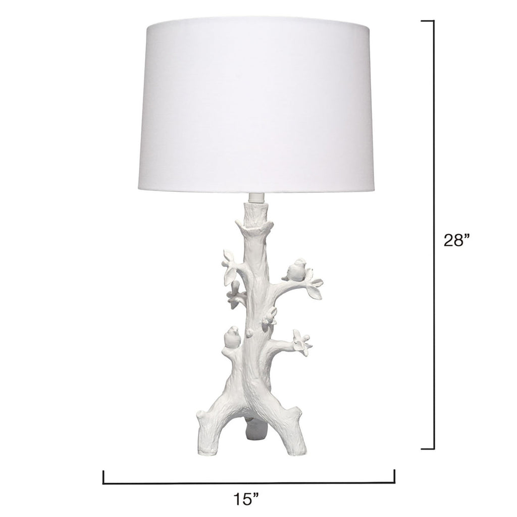 Artisans crafted the trunk-like base of this charming lamp from top-quality resin. Adorned with whimsical songbirds and sprouting leaves, its matte white finish paired with a white linen drum shade creates a clean and inviting look. A delightful bird-shaped finial completes the design. Place one on a side table, add a cozy chair, and you’ve created the perfect nook for story time.