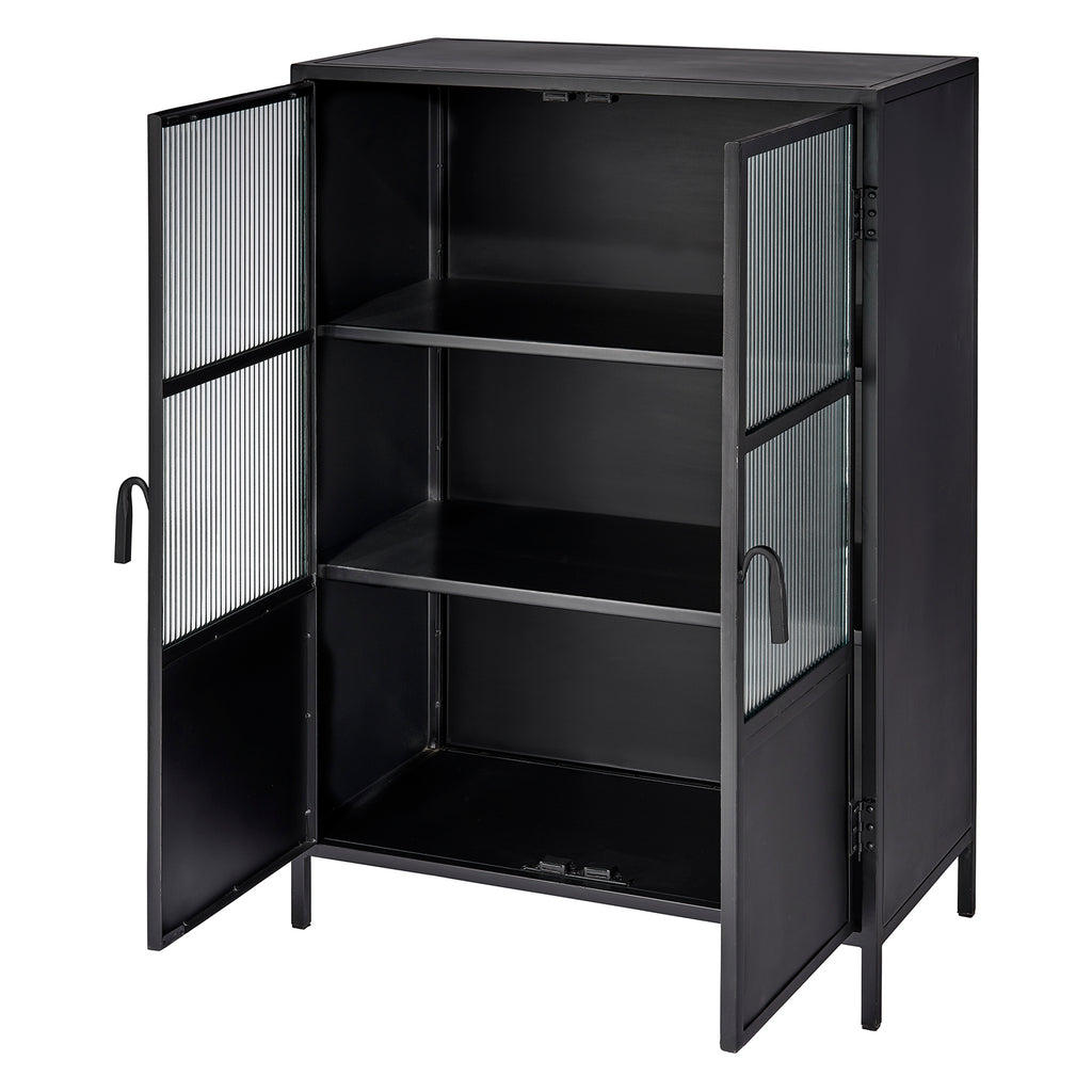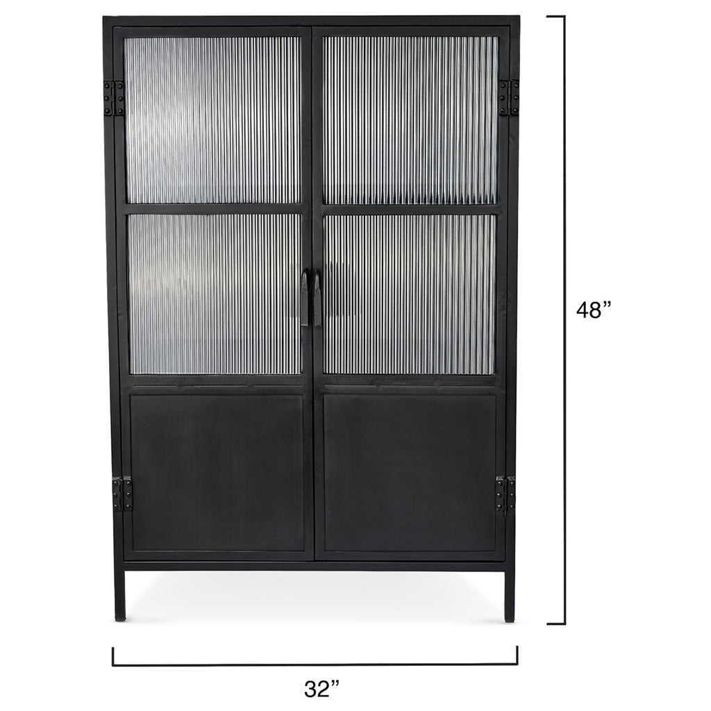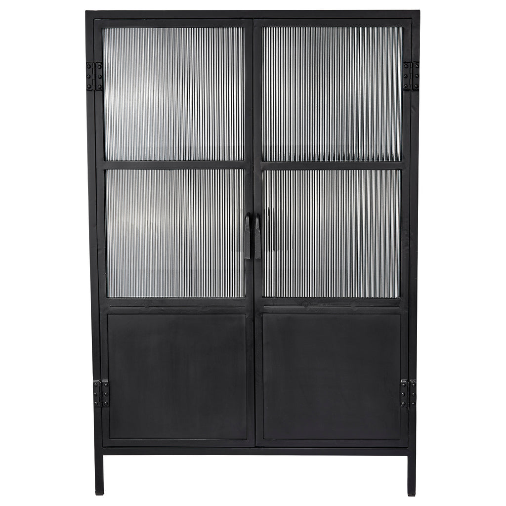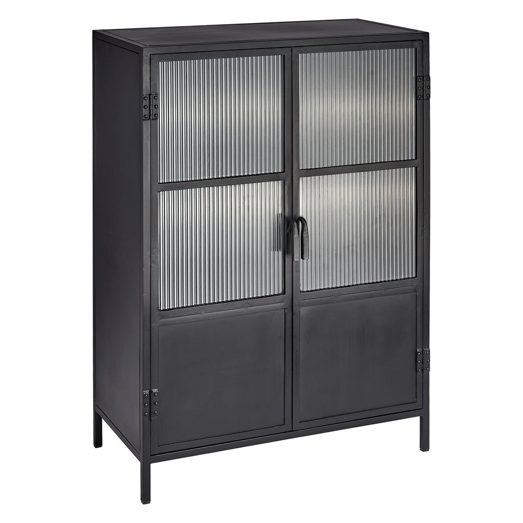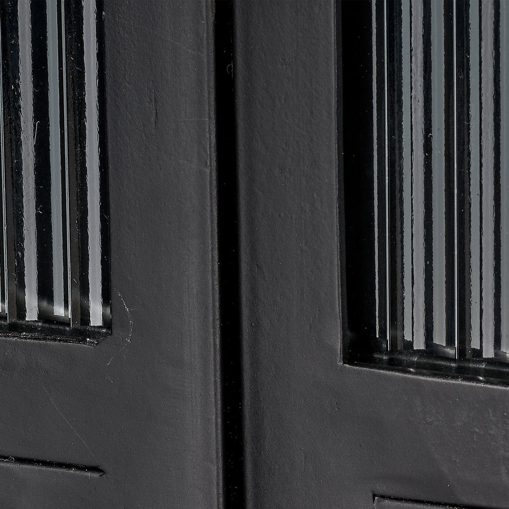 With an abundance of storage and tons of style, this industrial-edged dresser is ideal for an urban, contemporary décor. Handcrafted of minimally finished black metal, its two large doors open to reveal ample cupboard space and two fixed shelves. The simplicity of the design is elevated by panels of richly textural ribbed glass and hand-forged iron pulls. Use in a dining area to store serving dishes, in a media room as a unique television stand, or in a bedroom to store sweaters or blankets.