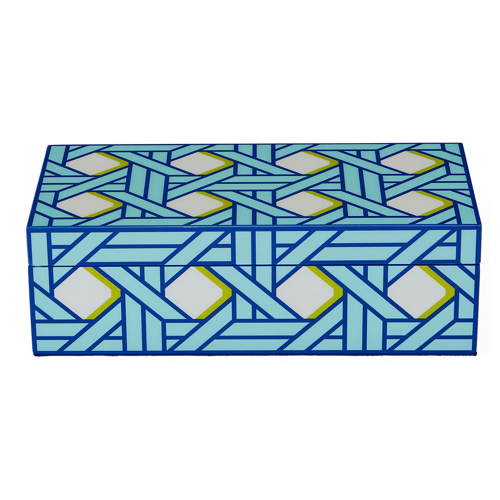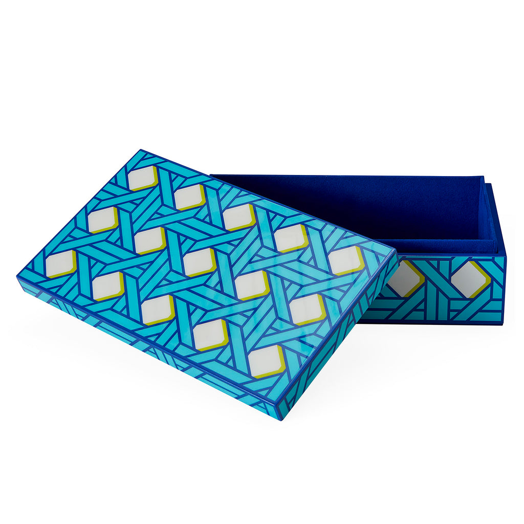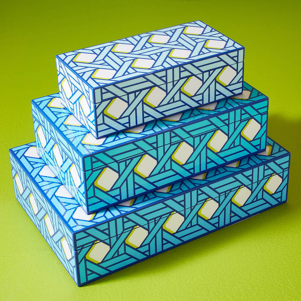 Featuring a traditional basket weave pattern in cool blues with a lime green accent. Velvet lined and hand-polished to high-gloss perfection. A posh, preppy, and tidying addition to your shelf, mantel, or tablescape. Keep your possessions handy but hidden. Available in three sizes for stashing, stacking, or making a stand-alone statement.