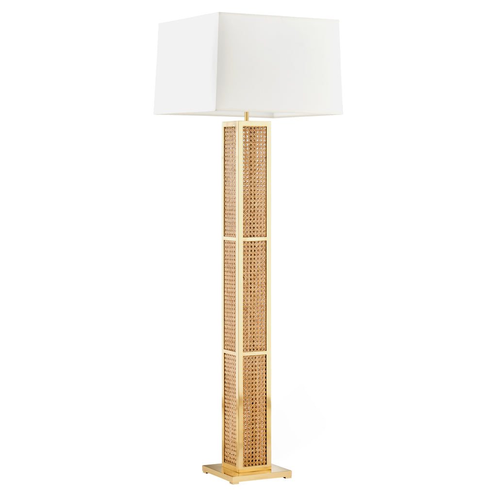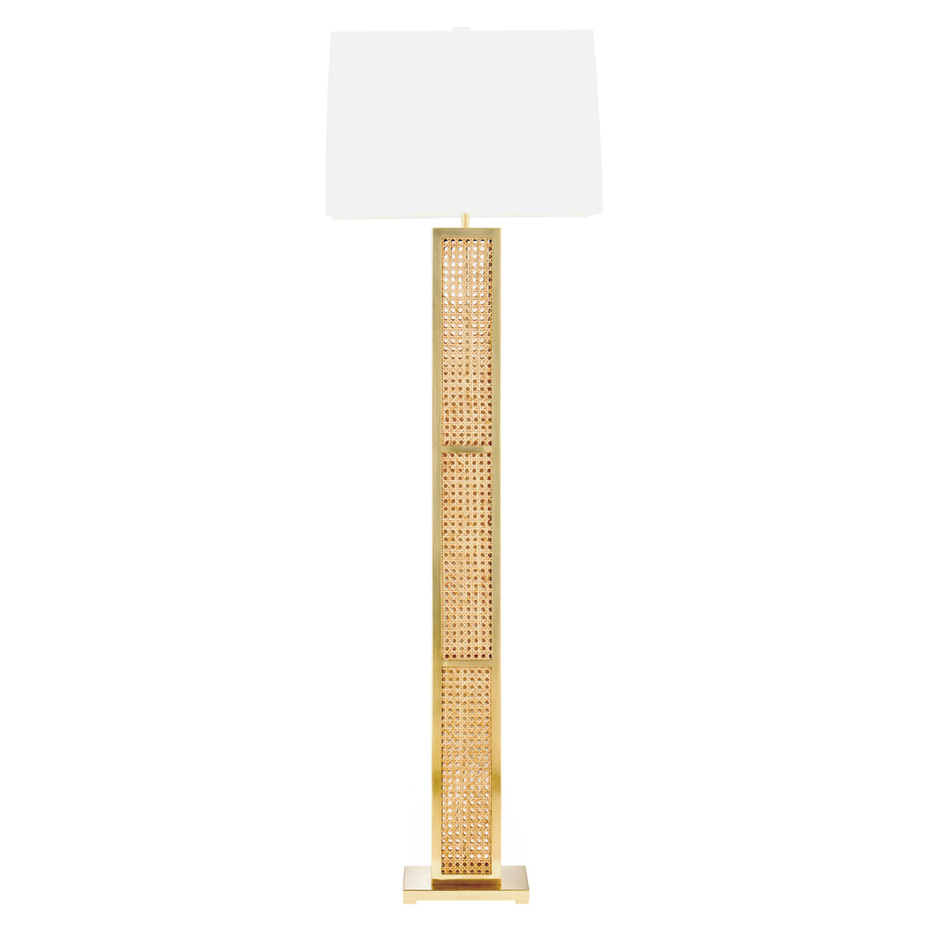 Classic French 50s rattan meets a chic and simple column in our Bellport Floor Lamp. Featuring caned rattan panels set in a modern brass framework, it's attention-getting in a corner or chic next to a sofa. Topped with a white fabric shade.