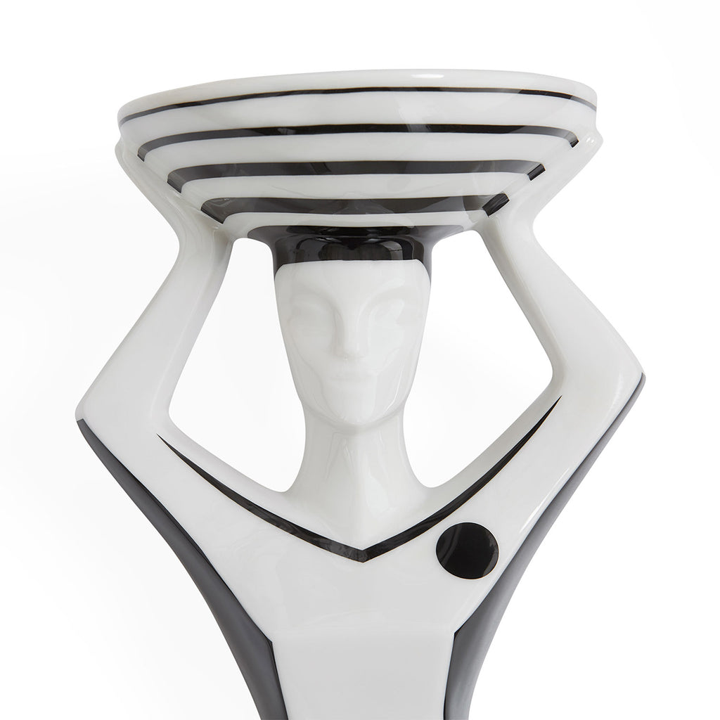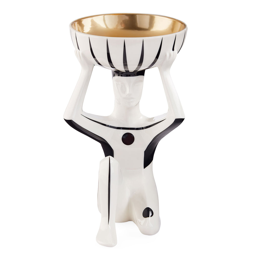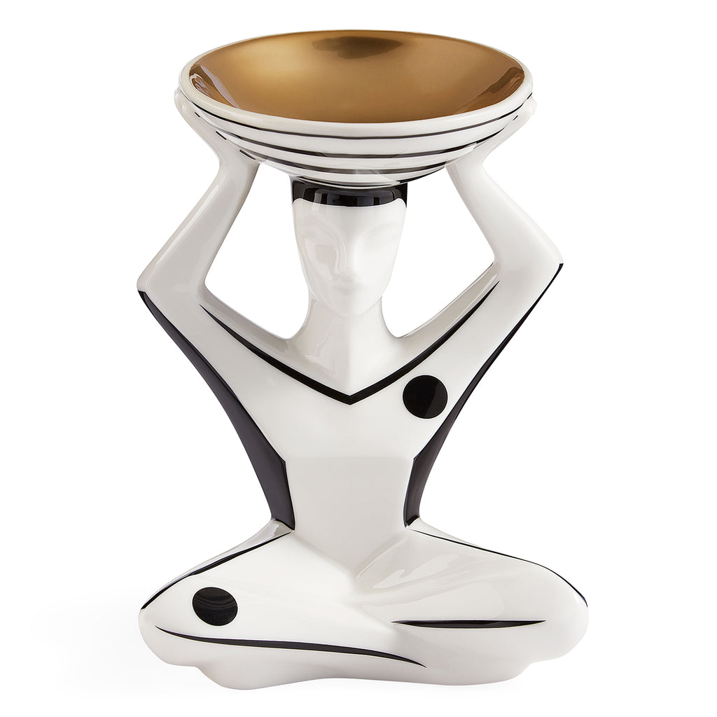 Faceted, elemental bodies shaped by Wiener Werkstätte inspired minimalism, our Budapest figures carry glittering gold-lined bowls on top of their heads. Crafted from white porcelain with a glossy finish, and featuring black satellite dots and intentional black strokes that add definition and give a graphic feel. Available in two sizes meant to style together.