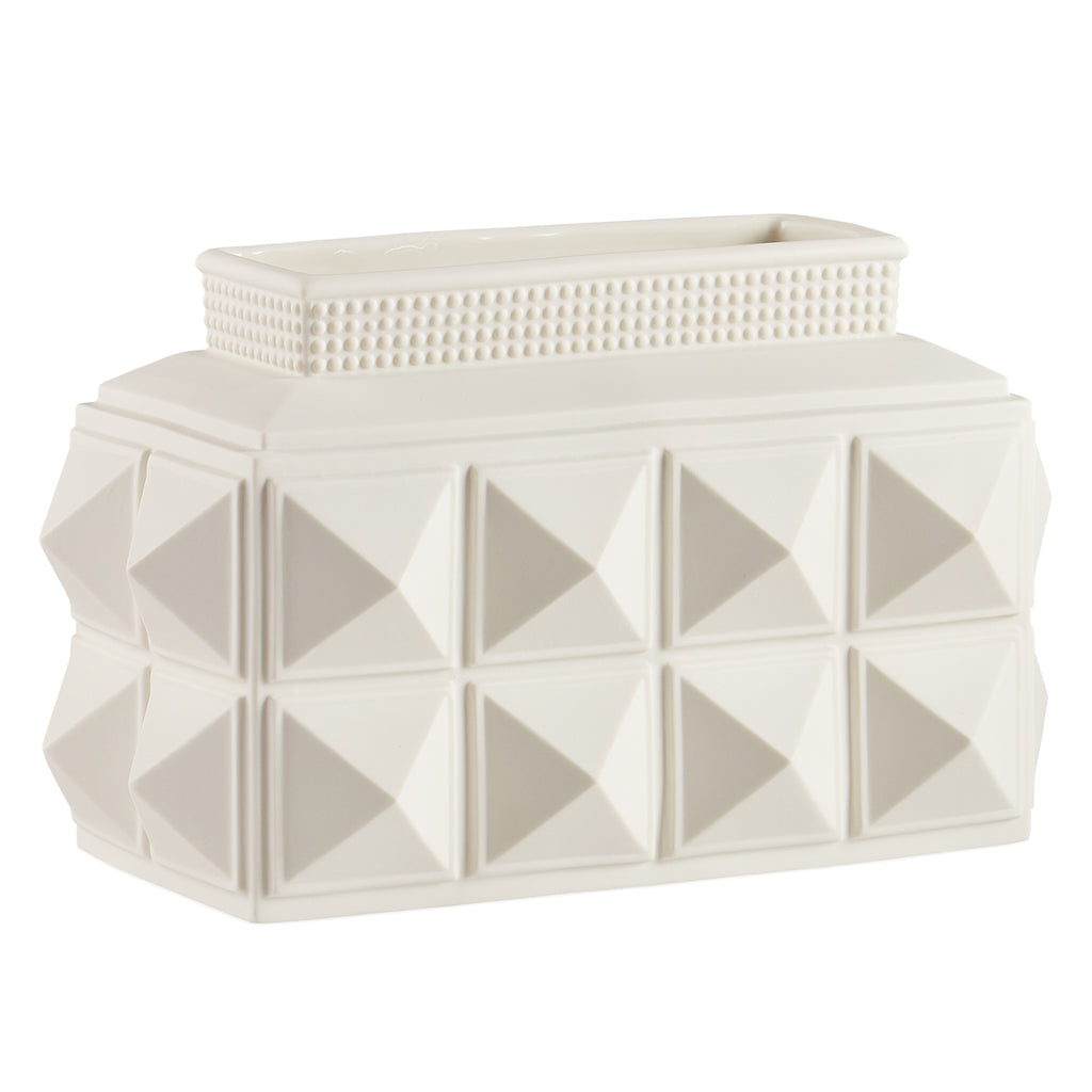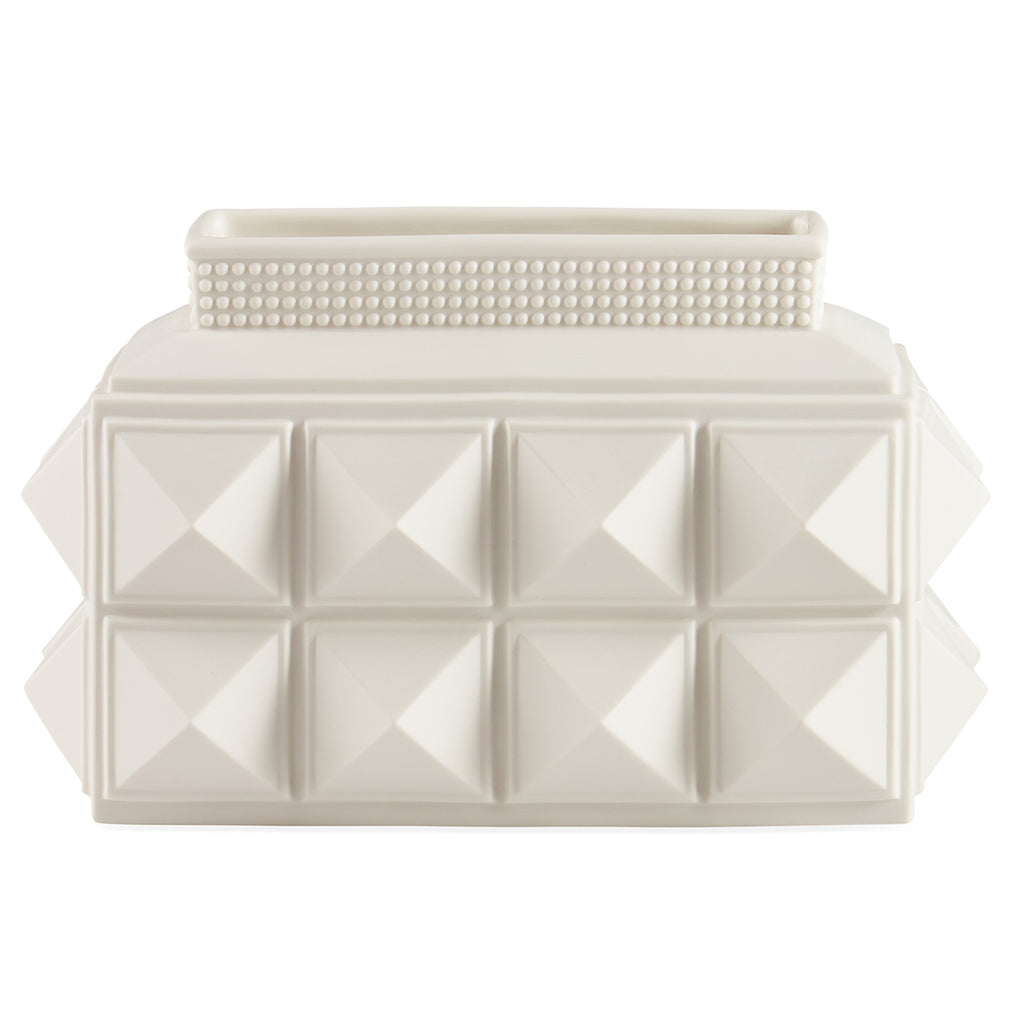 Edgy and elegant at once, our Charade collection features glamorous, thoughtfully hand-carved details cast in the highest quality matte porcelain. With sharp lines and a graphic silhouette, our Charade Studded Low Vase also features a timeless unglazed exterior for added dimension. Tough glamour has never looked so good: perfect on an entryway console or taking center stage in a blanc tablescape.