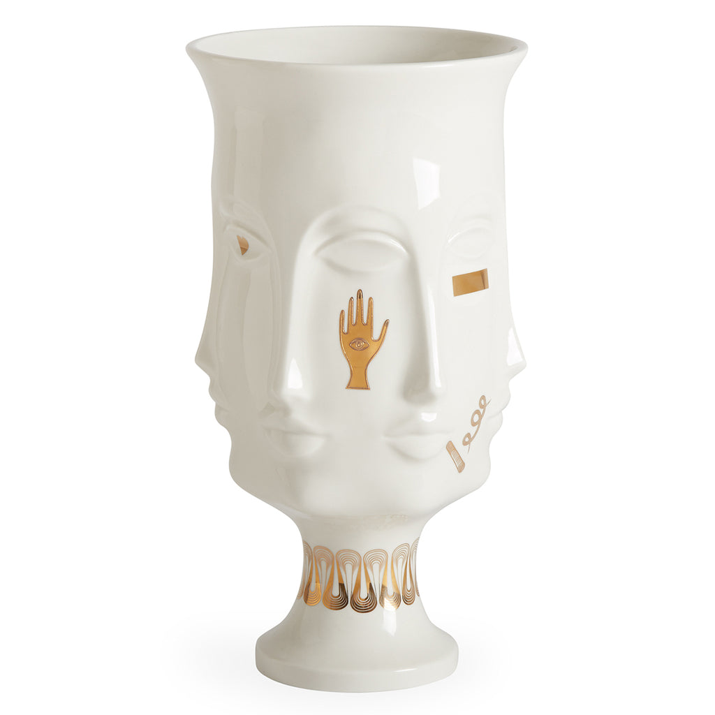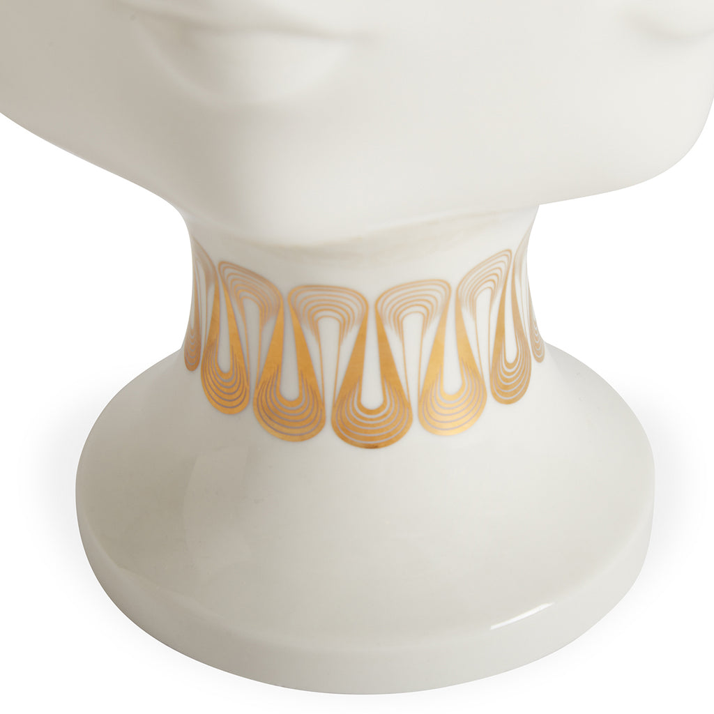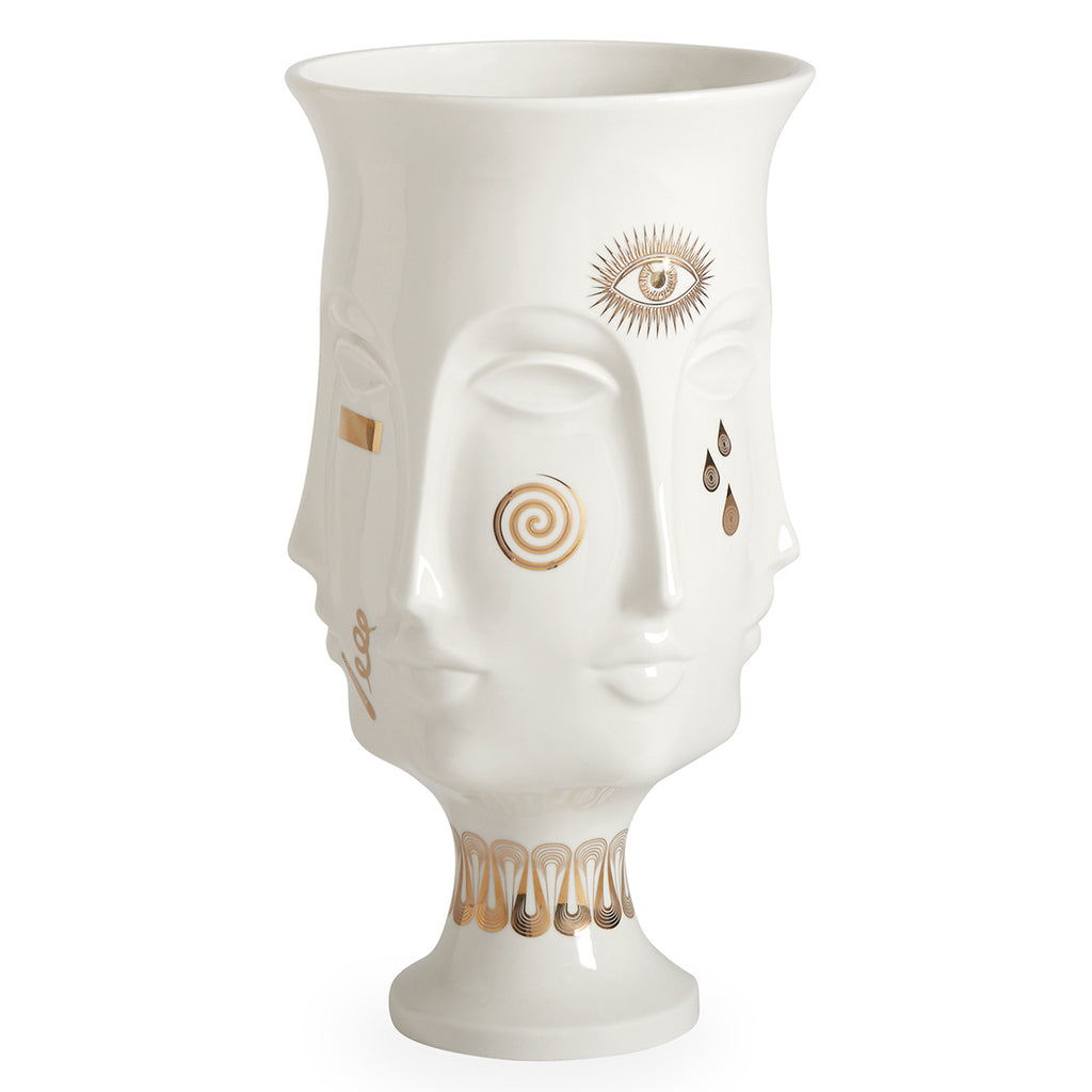 Subversive signs and symbols rendered in glittering gold adorn the glossy high fired porcelain pieces—signature favorites with the glamour cranked up to 11. The Jonathan Adler Gilded Dora Maar Urn turns heads—instant intrigue for your mantel or tabletop. Inspired by Dora Maar, the French photographer, poet, and painter best known for being a lover and muse of Pablo Picasso. Jonathan throws the models for the Muse vessels and then substitutes our signature geometric relief patterns with body parts—faces, breasts, lips—to create a surreal style. Each piece is inspired by our favorite artists' muses.