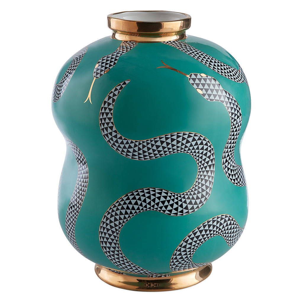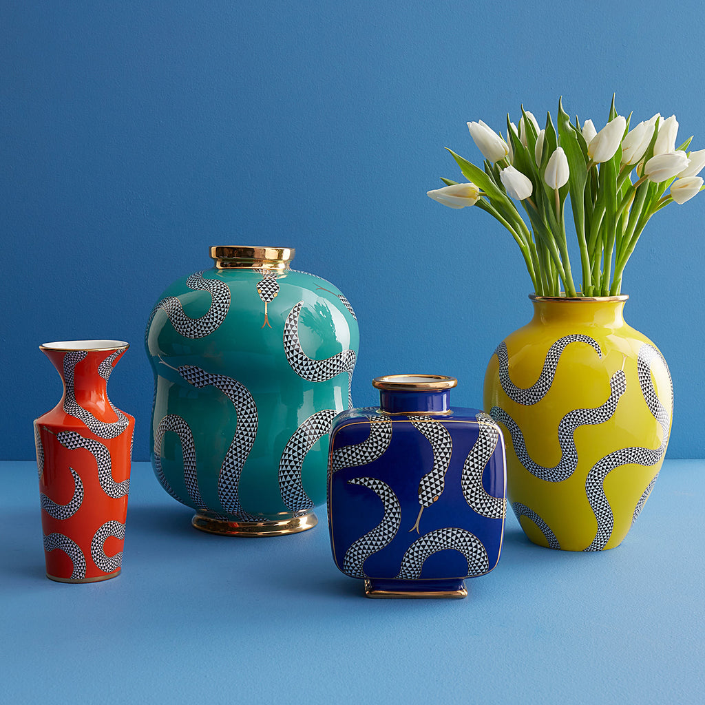 A striking addition to any table, shelf, or mantel, our Eden vases feature our signature slithering serpents on punchy pop-toned hues. Sparkling gold accents add an air of daring and glamour. Eden’s classic silhouettes mix well with others, or style the collection together for extra bite.