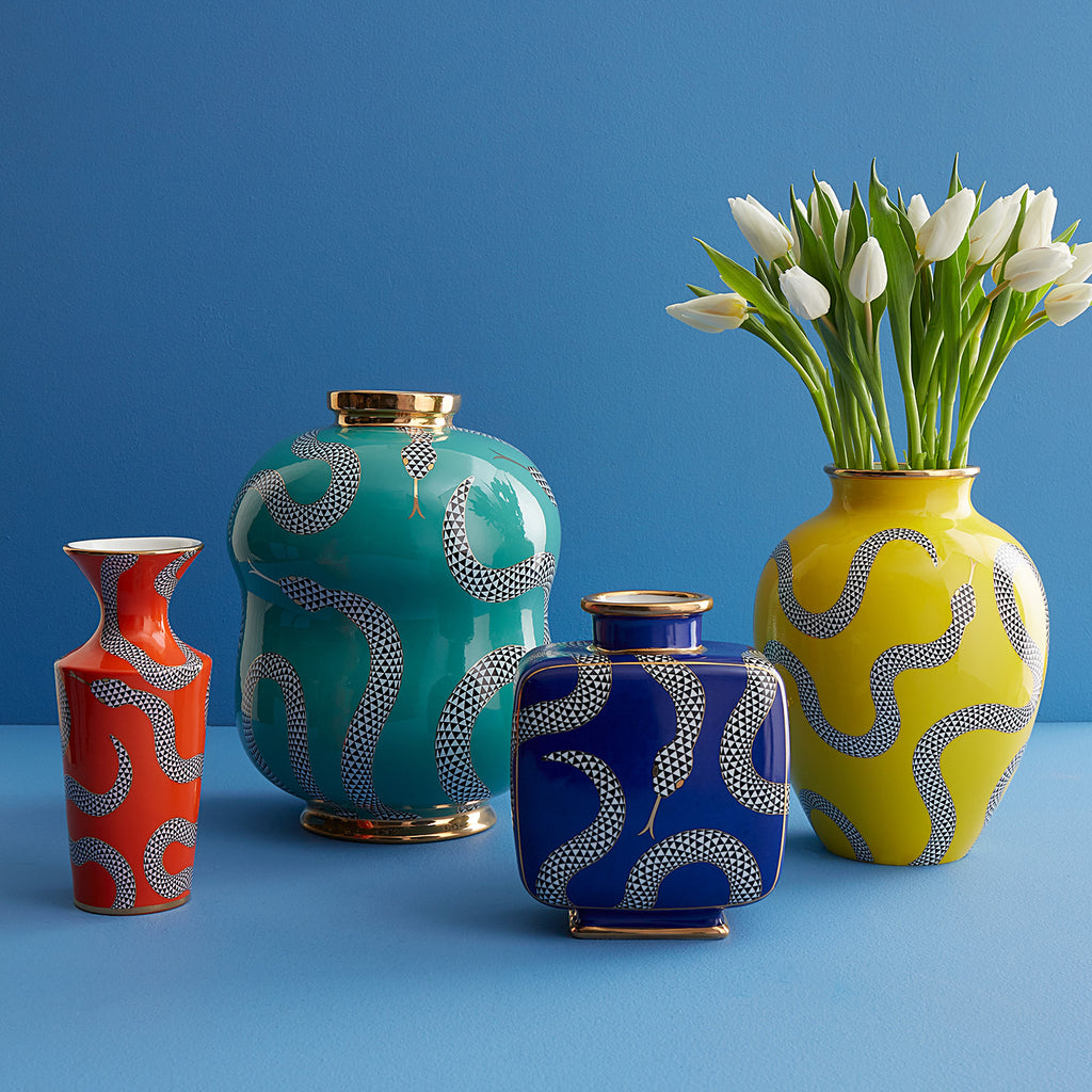 A striking addition to any table, shelf, or mantel, our Eden vases feature our signature slithering serpents on punchy pop-toned hues. Sparkling gold accents add an air of daring and glamour. Eden’s classic silhouettes mix well with others, or style the collection together for extra bite.
