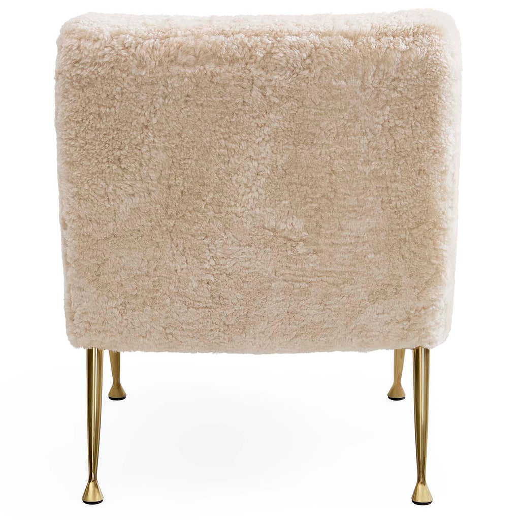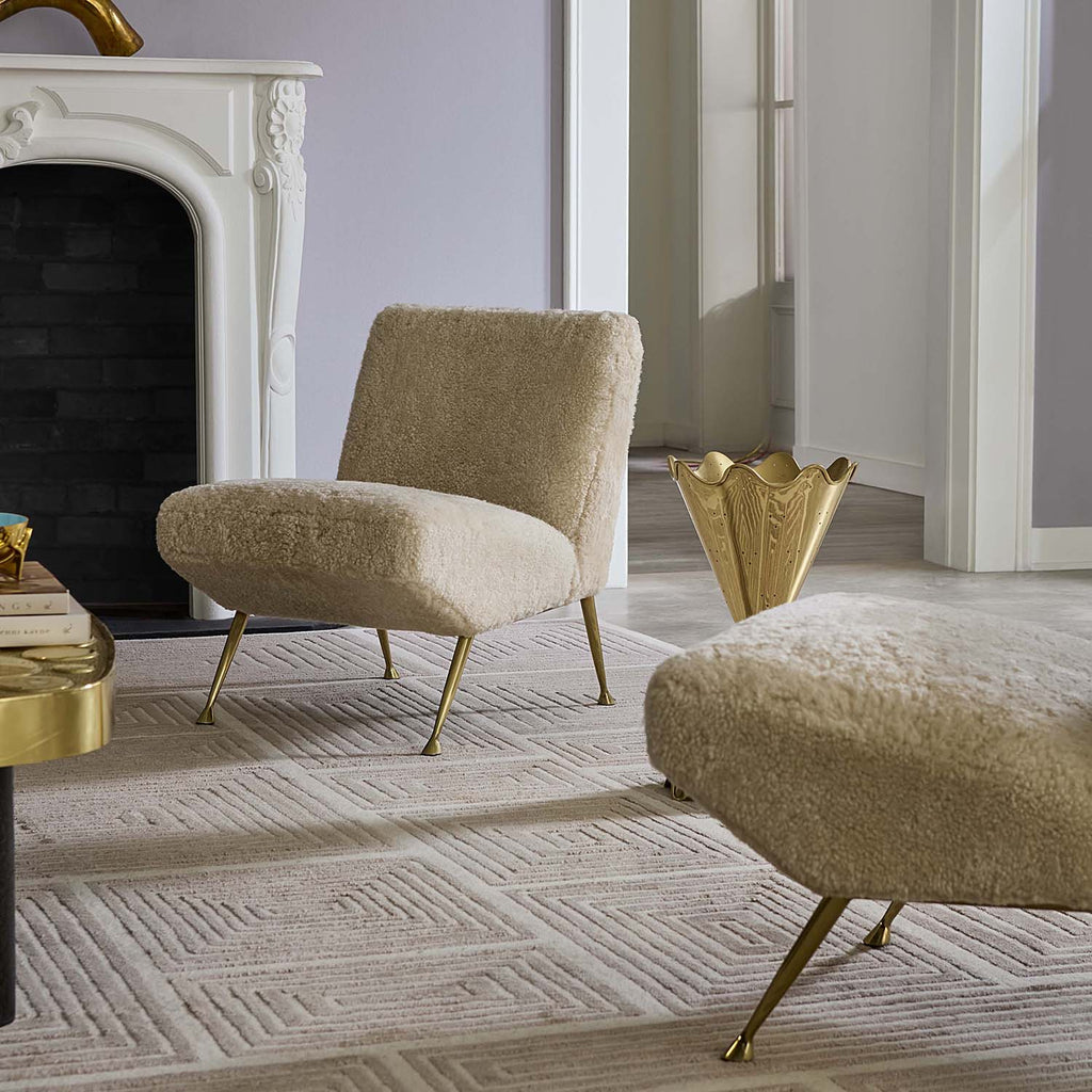 The French flea market find every curated home needs: vintage-inspired, timelessly modern. Our Gainsbourg Slipper Chair features a thick, cushy seat that gives trapezoidal angularity from every side. Modern brass legs and an ultra-cozy shearling keep this petite but powerful seat rich in glamorous detail. Perfect for flanking your chalet's fireplace or adding a seat in a chic boudoir.