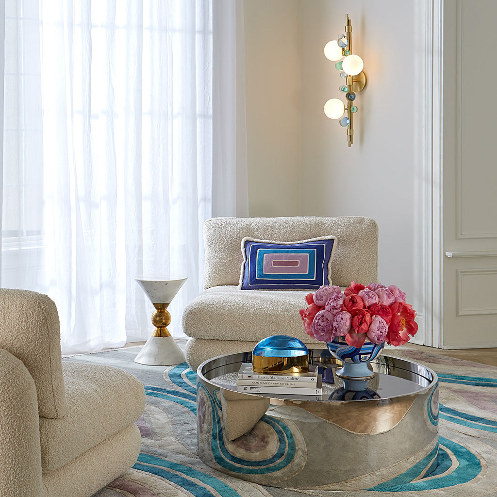 Welcome to our world of dreamy, high-voltage glamour. A constellation of jewel-toned acrylic and opaque white orbs float on a brushed brass stem—luxe and luminous in a small space, out of this world flanking an entry console. Our sculptural Globo lighting resuscitates conventional interiors and adds an ultra-glam polish to swanky spaces.