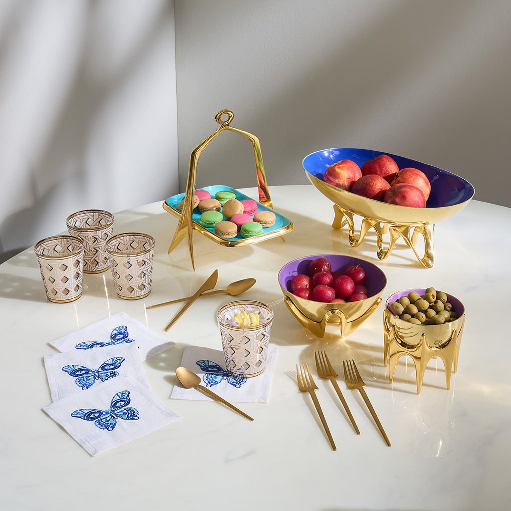 Rendered in solid brass with rich colored enameled interiors, our Oscar Bowls are inspired by midcentury architecture, but also add a pop of jewel-like color to your tablescape. A couture presence on your cocktail table or vanity, they’re are also divine for dinner parties. Group them together to see our whole range of marine and purple-toned hues. Jonathan and his team design and sculpt each prototype by hand in our Soho studio. Then, they're sand-cast in solid brass and polished to perfection by hand.