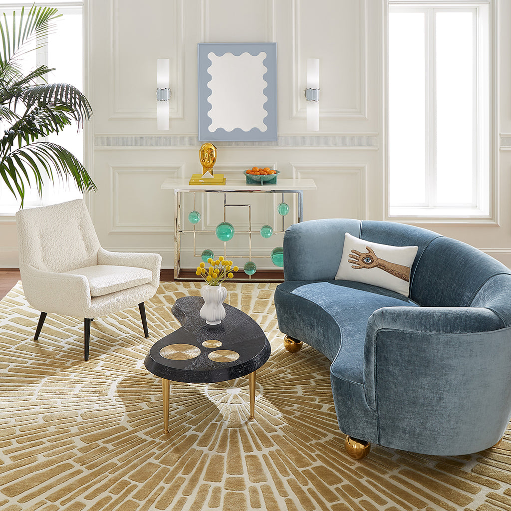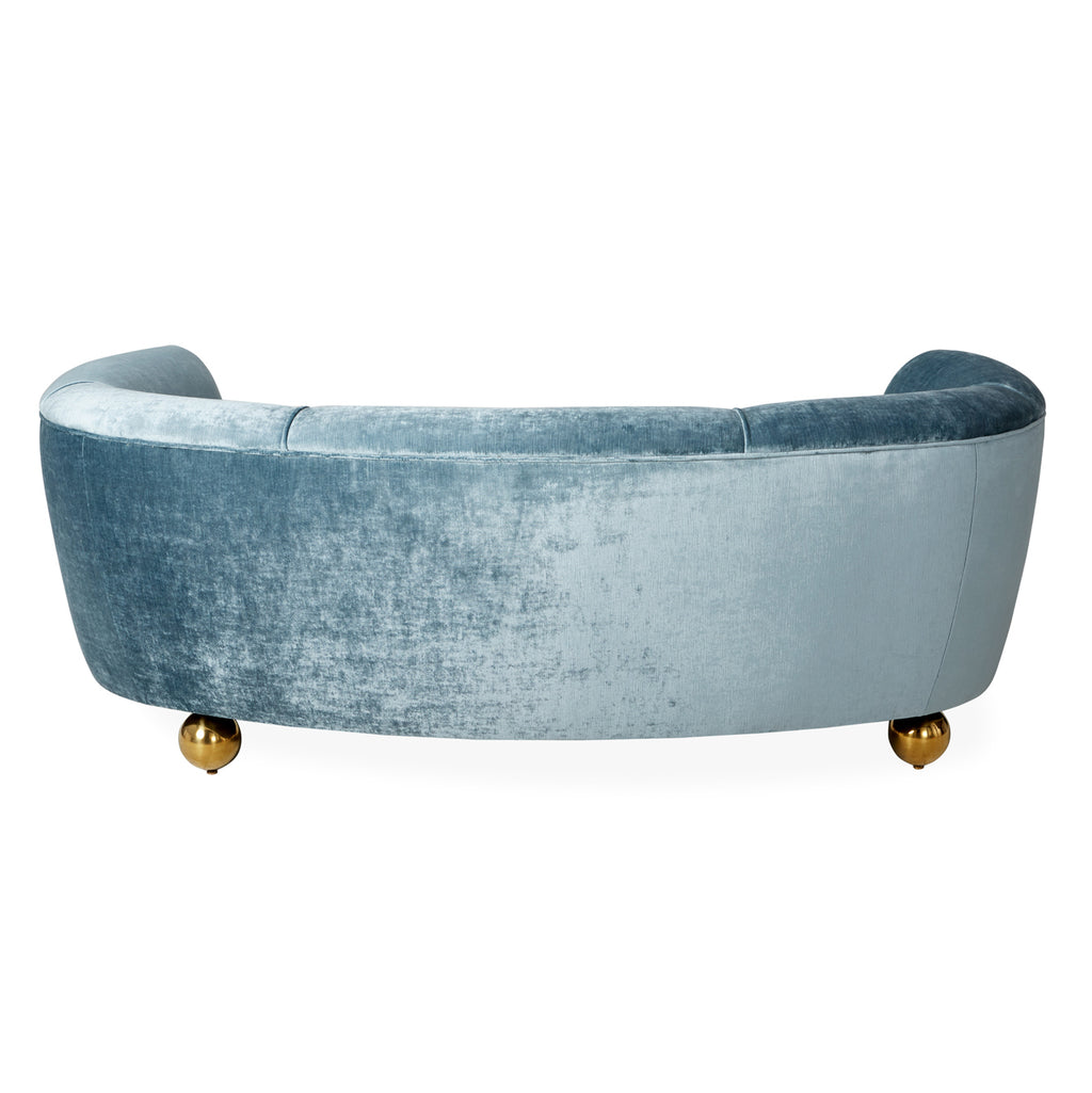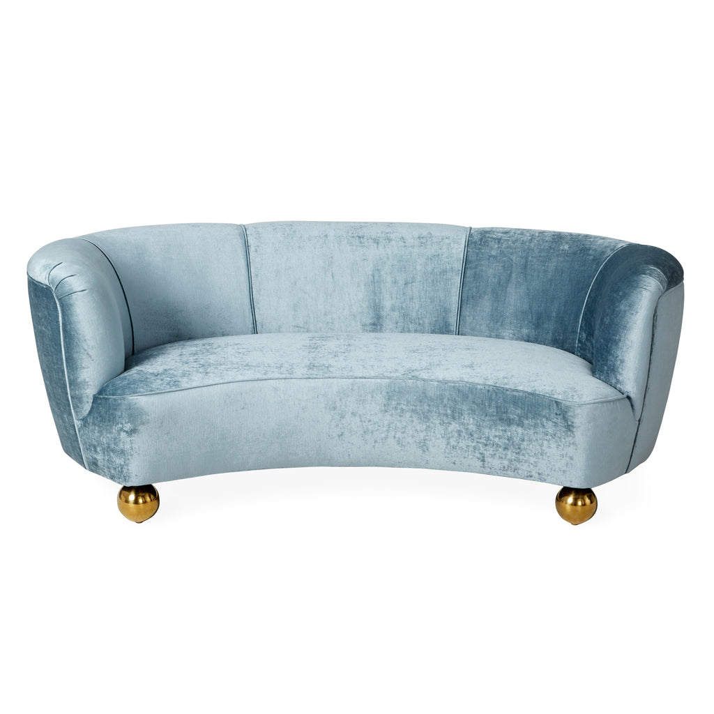 The Jonathan Adler petite Parker Curved Sofa's inviting, gentle curve channels aprés-ski chic in textural Teddy and is an eye-catching gem in saturated blue. We swapped traditional bun feet with polished brass orbs for a glint of glamour. A super comfortable, incredibly chic power piece that fits wherever you need a fabulous seat.