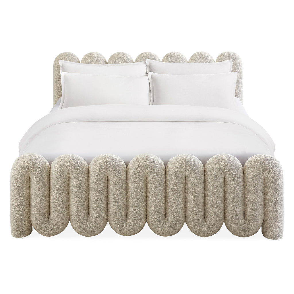 The Jonathan Adler Serpentine Bed features an ultra-mod tubular framework at the head and foot and is wrapped all the way around in our luxe yet hardworking Olympus Oatmeal bouclé—stain resistant and chic. Simple and modern but also warm and inviting, it's brilliant in a minimalist Malibu boudoir or anchoring your Tribeca loft's lair.