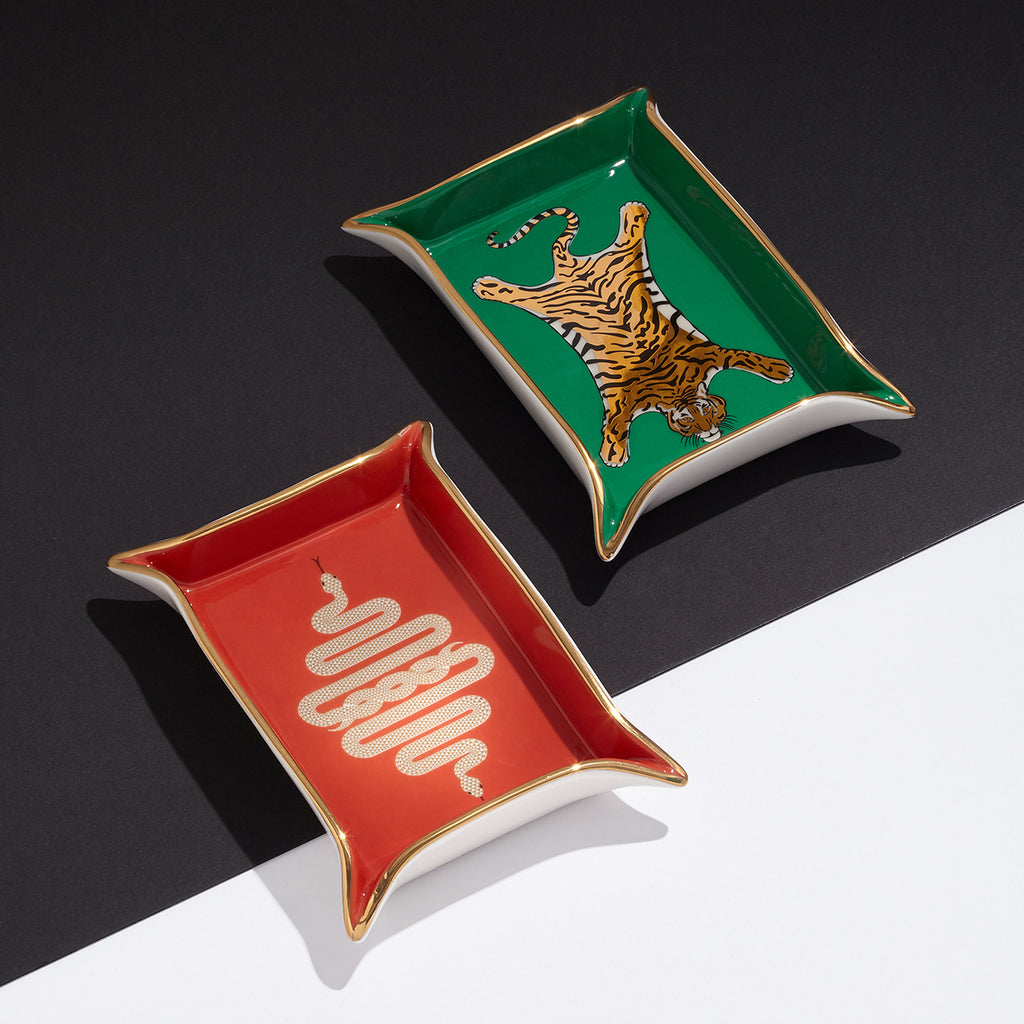 Jonathan Adler updated the classic form of a leather valet tray in posh porcelain. In bold emerald, our Tiger Tray features a dangerously divine tiger rug shape, while our Snake Tray features a slithering and shimmering pair of gold serpents on poppy orange. Fab on an entryway table for your keys or as a bedside catchall for your precious jewels. Packaged in a nifty gift box, it makes a perfect hostess present.