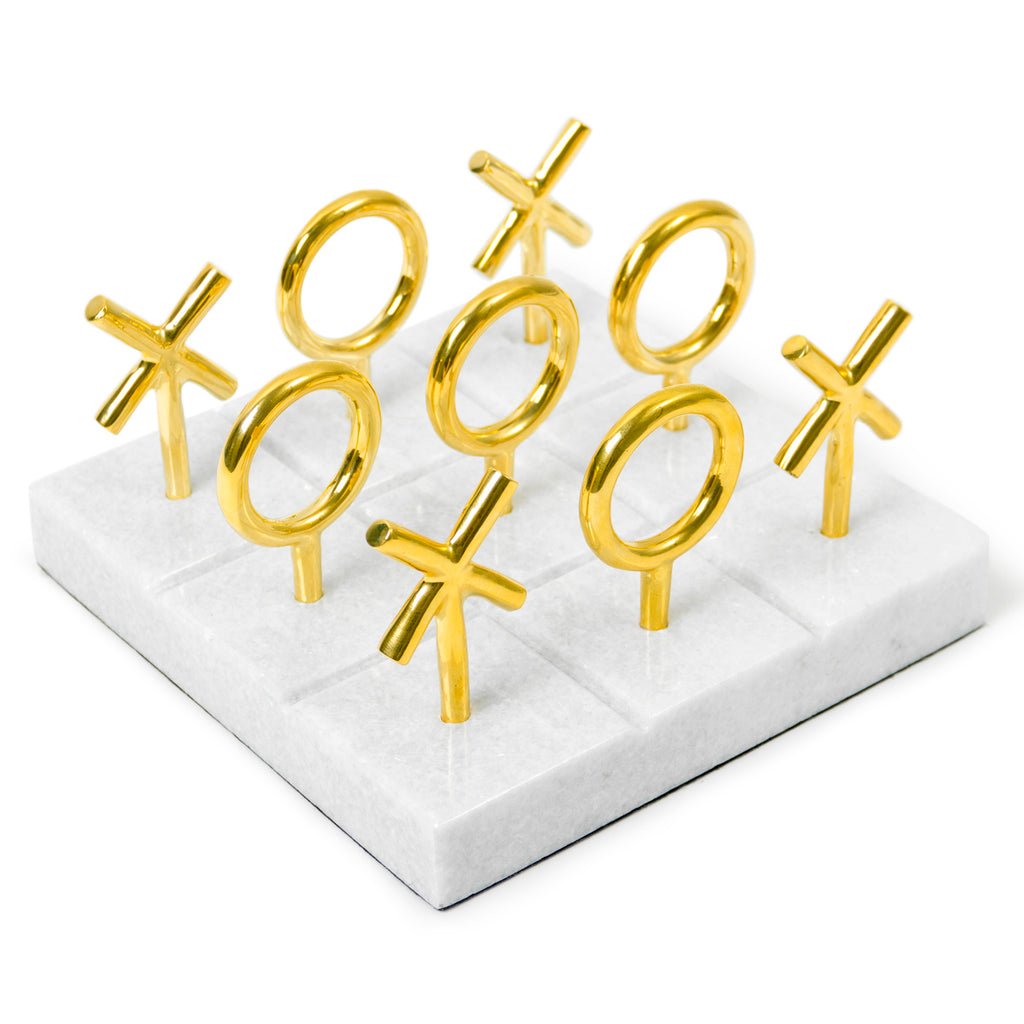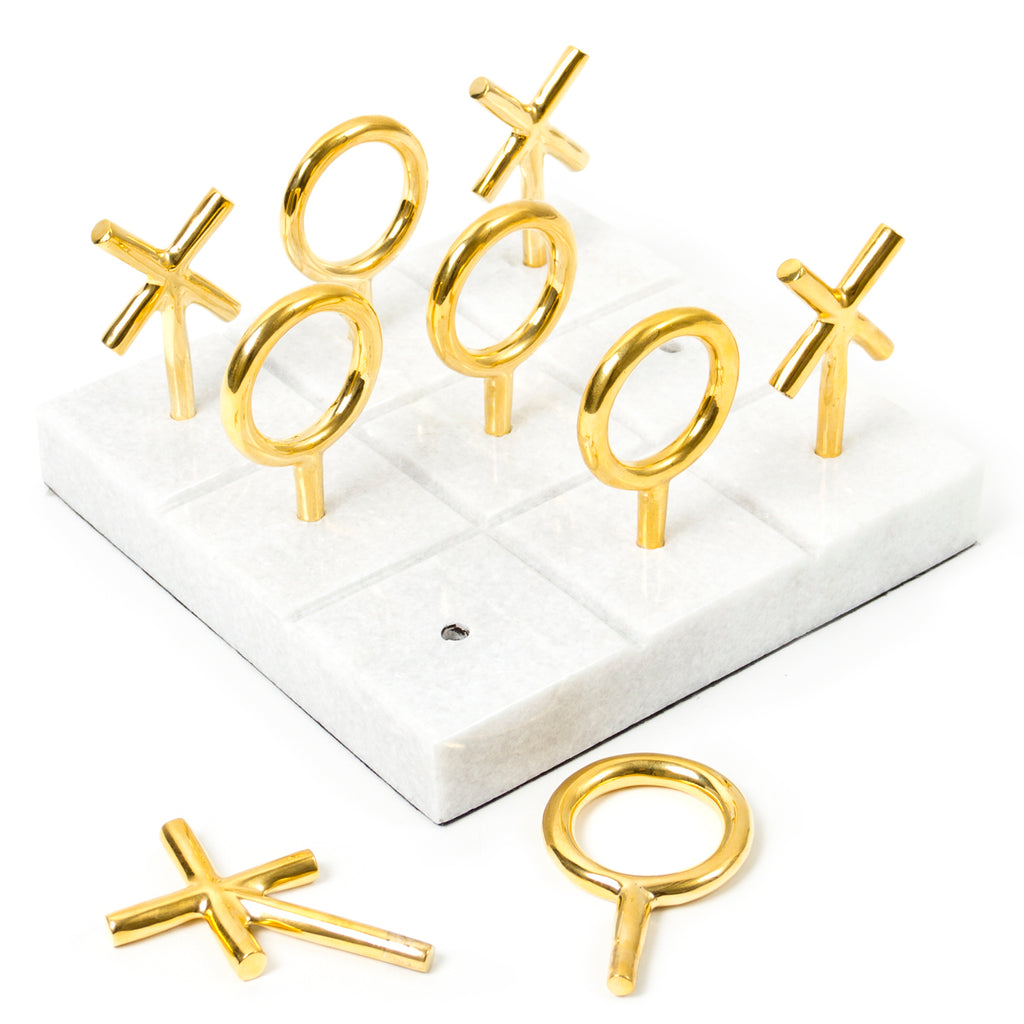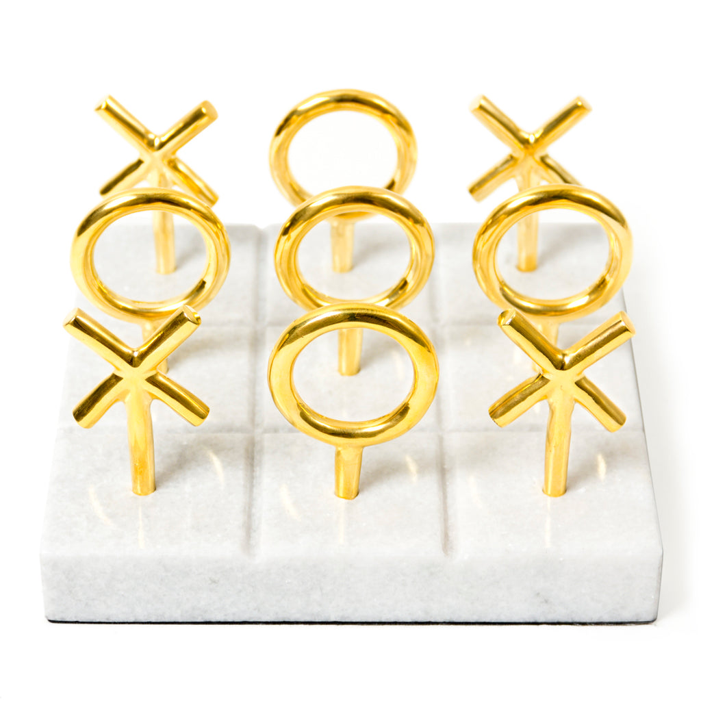 Play to win with our posh Jonathan Adler brass and marble Tic-Tac-Toe set. The grooved marble base is the perfect board for the sculptural brass playing pieces. Each piece in our collection of brass bibelots is designed and sculpted by Jonathan and his team in the Soho studio. Next, it's cast in solid brass and polished to perfection by hand. Like a fine wine or your favorite leather jacket, our brass only gets better with age. Over time, the polished brass will develop a rich natural patina. If desired, use a microfiber cloth to buff out fingerprints. If you have no patience for patina, use a brass polish.