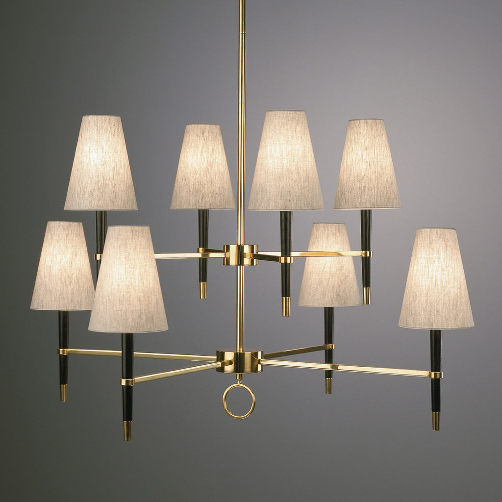 The Jonathan Adler Ventana Two-Tier Chandelier is elegant and ladylike in ivory wood with polished nickel accents or timelessly handsome in ebonized wood with antiqued brass or polished nickel accents. Topped with natural linen shades.