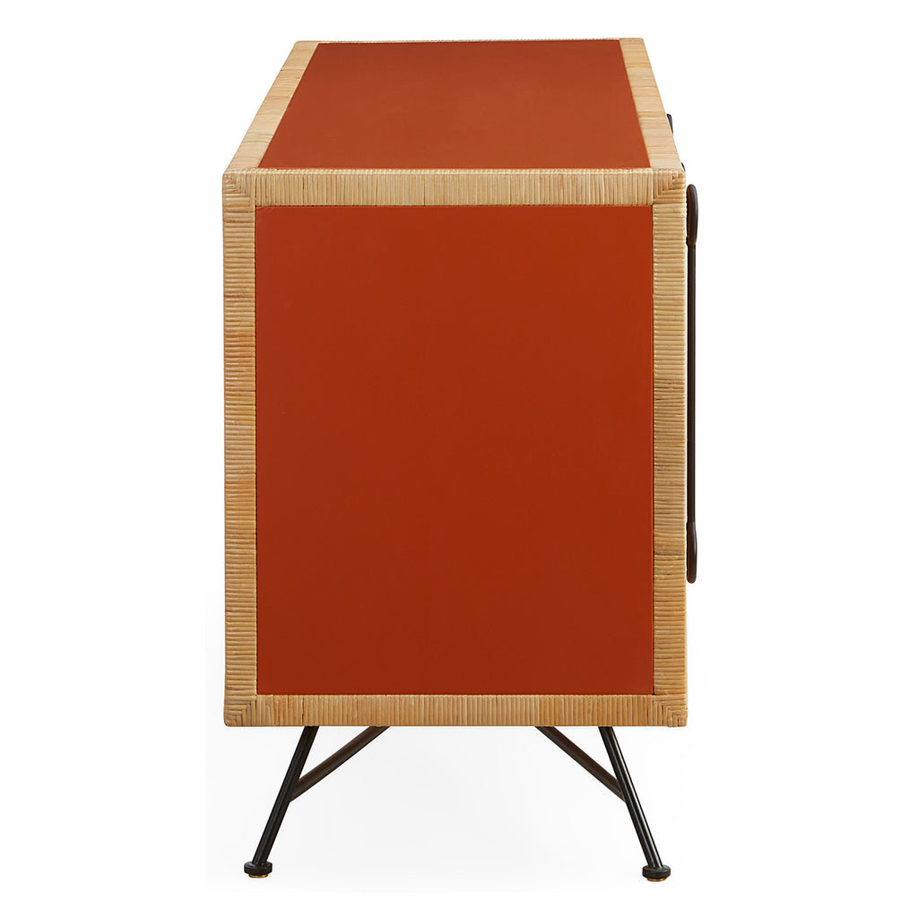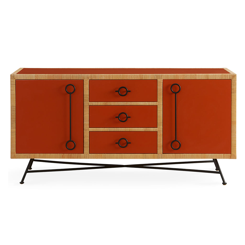 Riviera chic with equestrian edge and a hint of pop. The Jonathan Adler Wellington Credenza features wrapped rattan peel edging inset with high-gloss orange lacquer all around. Perched n a sculptural blackened steel frame and fixed with blackened steel pulls with loop details. Couture storage that hits all the right notes whether in the hall, behind the sofa, or duetting with your dining table. Matching natural materials with a flash of couture color, our Wellington furniture collection is made for the modern jet-setter’s dream abode. Style with our Wellington lighting for chic and coordinated laissez-faire fabulousness.