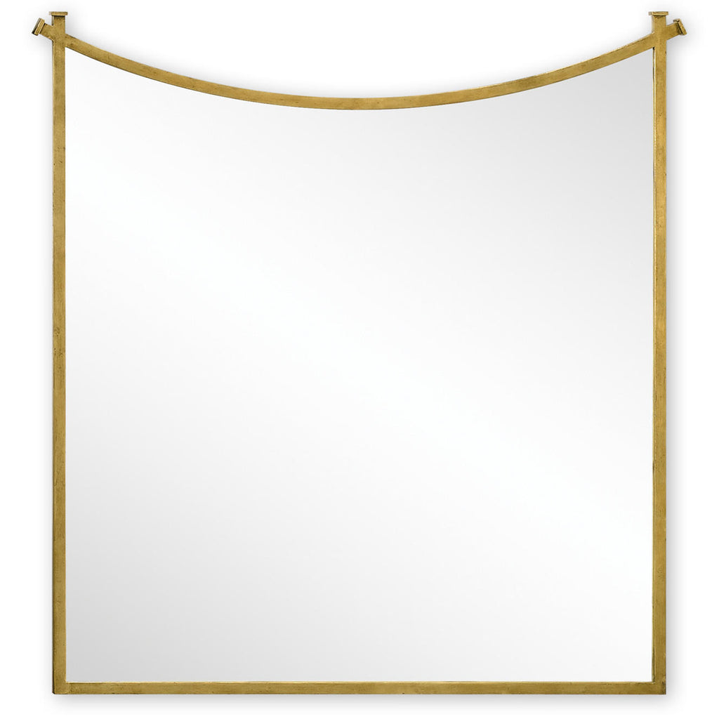 Contemporary plain glass, antique gilded iron mirror with thin borders. The inverted arch and intersecting the uprights create flat-capped decorative corners.