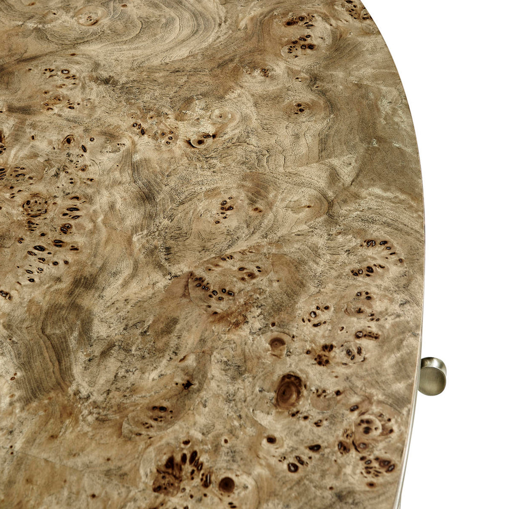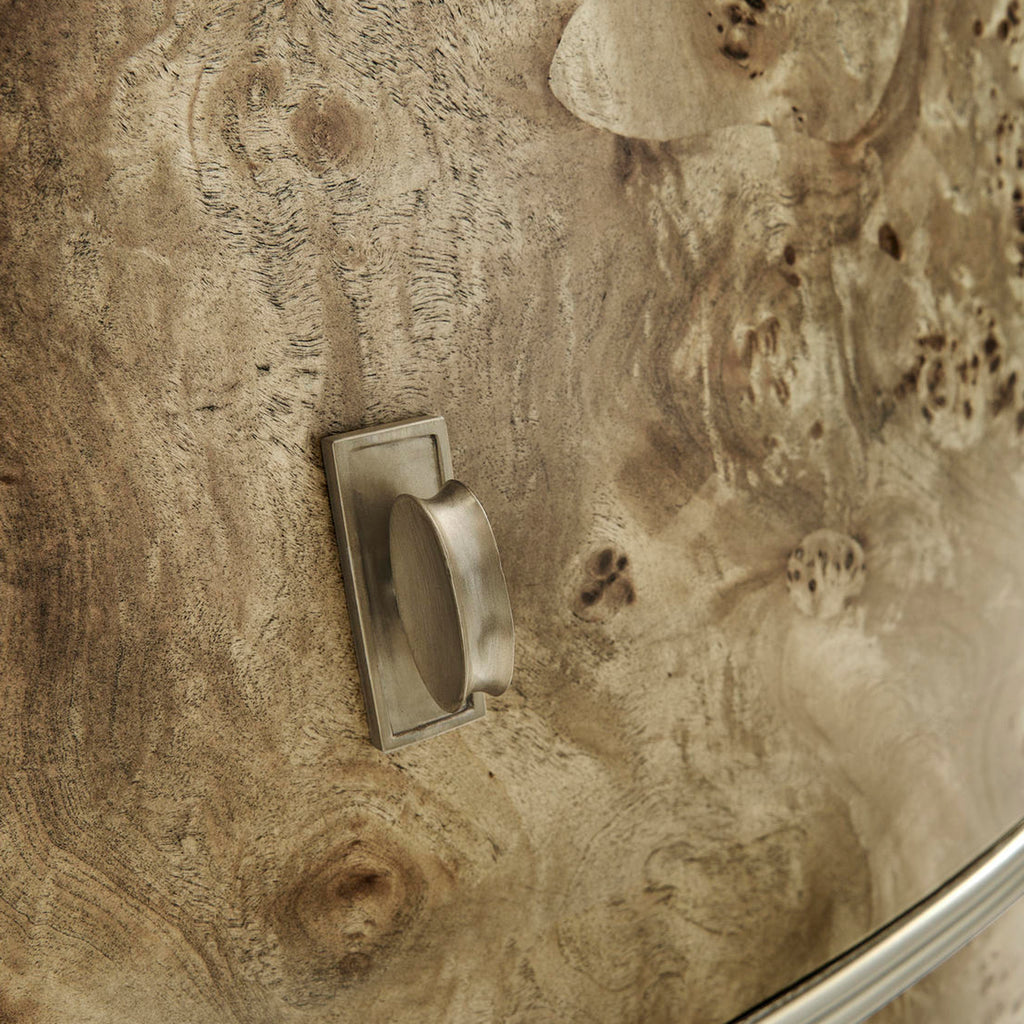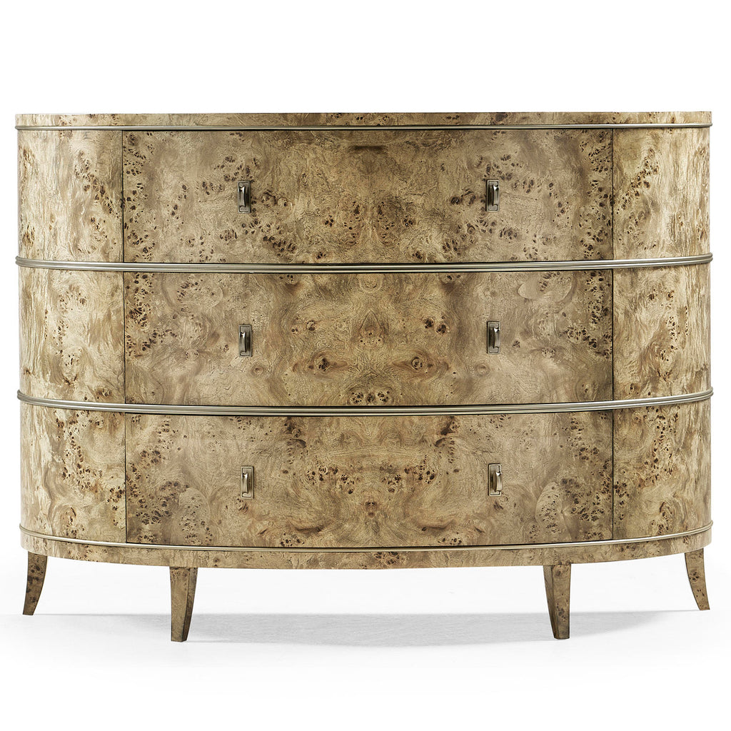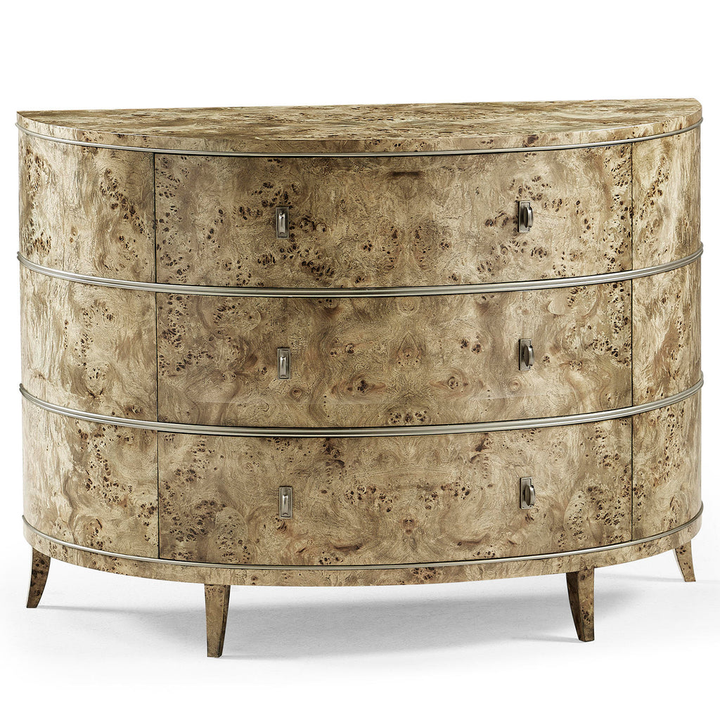 Wrapped in Mappa Burl veneers with a seductive Amber Matte finish, the Jonathan Charles Reimagined Fulgurite Demi Lune from Jonathan Charles’ Reimagined portfolio makes an enchanting and sophisticated statement in entryways and living spaces. A solid case with 3 drawers feature hand cast pulls and a decorative brass bead trim while the Mappa Burl veneer offers a mesmerizing illusion of depth and movement.