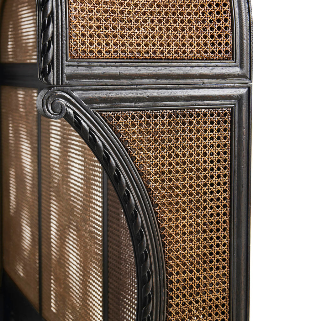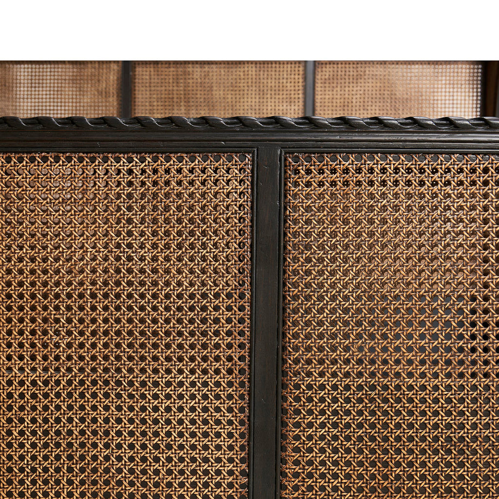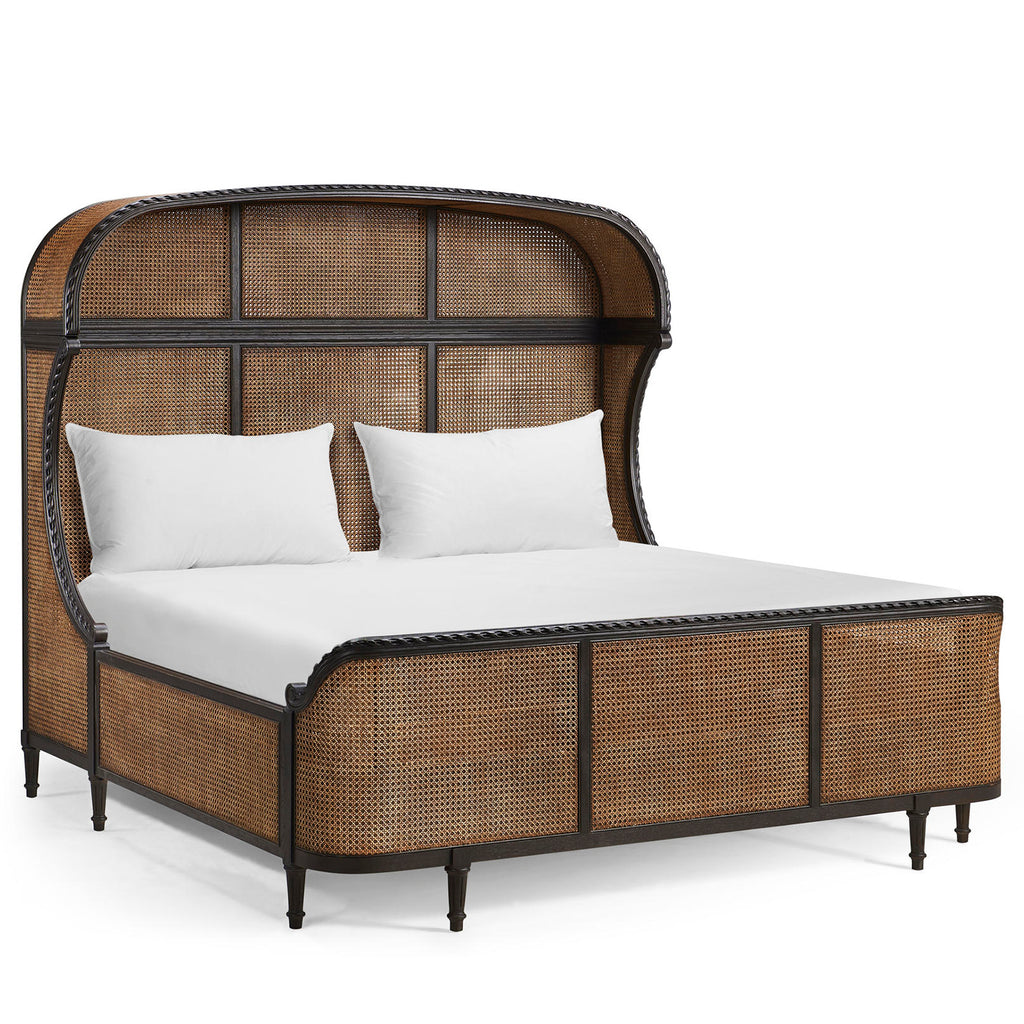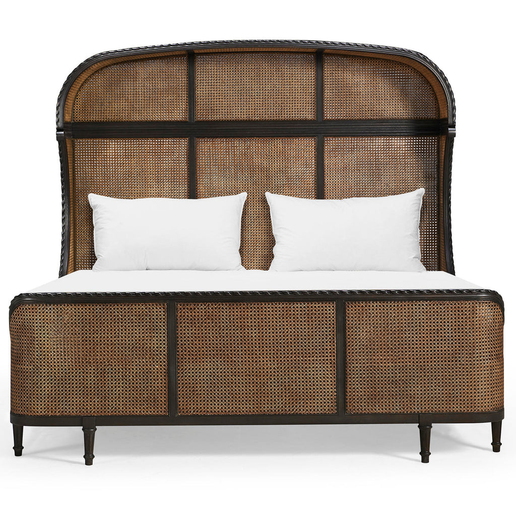 • Ebonized oak frame features rope carvings around headboard and footboard