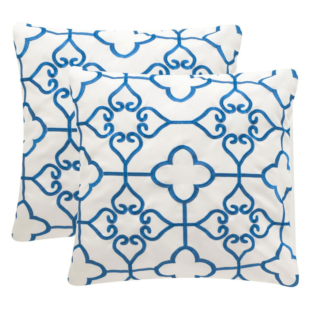 Garden lattice patterns, colored in soft sweet green or royal blue, reach across the silky white background of this accent pillow. Made from durable, easy-care polypropylene fiber for long-lasting, weather-resistant beauty. Sold as set of two.