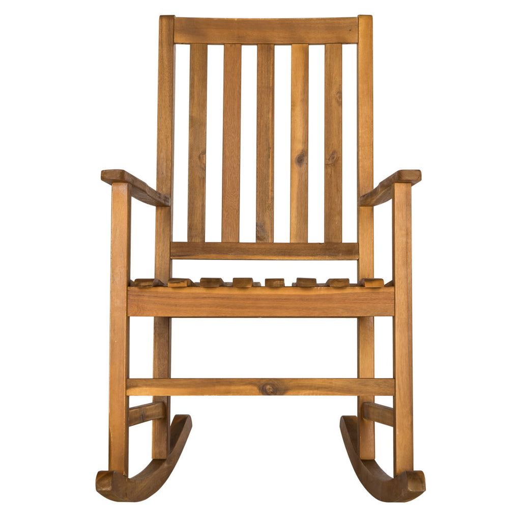 The classic front porch rocker gets a fresh new look in a new edition crafted of sustainable acacia wood finished in a fashionable tone of natural.  With straightforward lines reminiscent of Shaker style, this outdoor rocking chair defines casual living.
