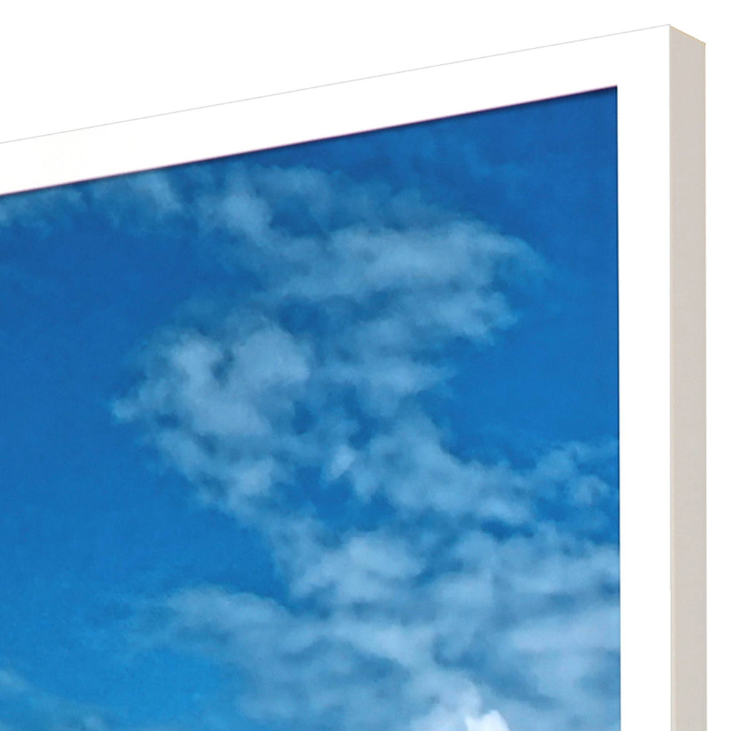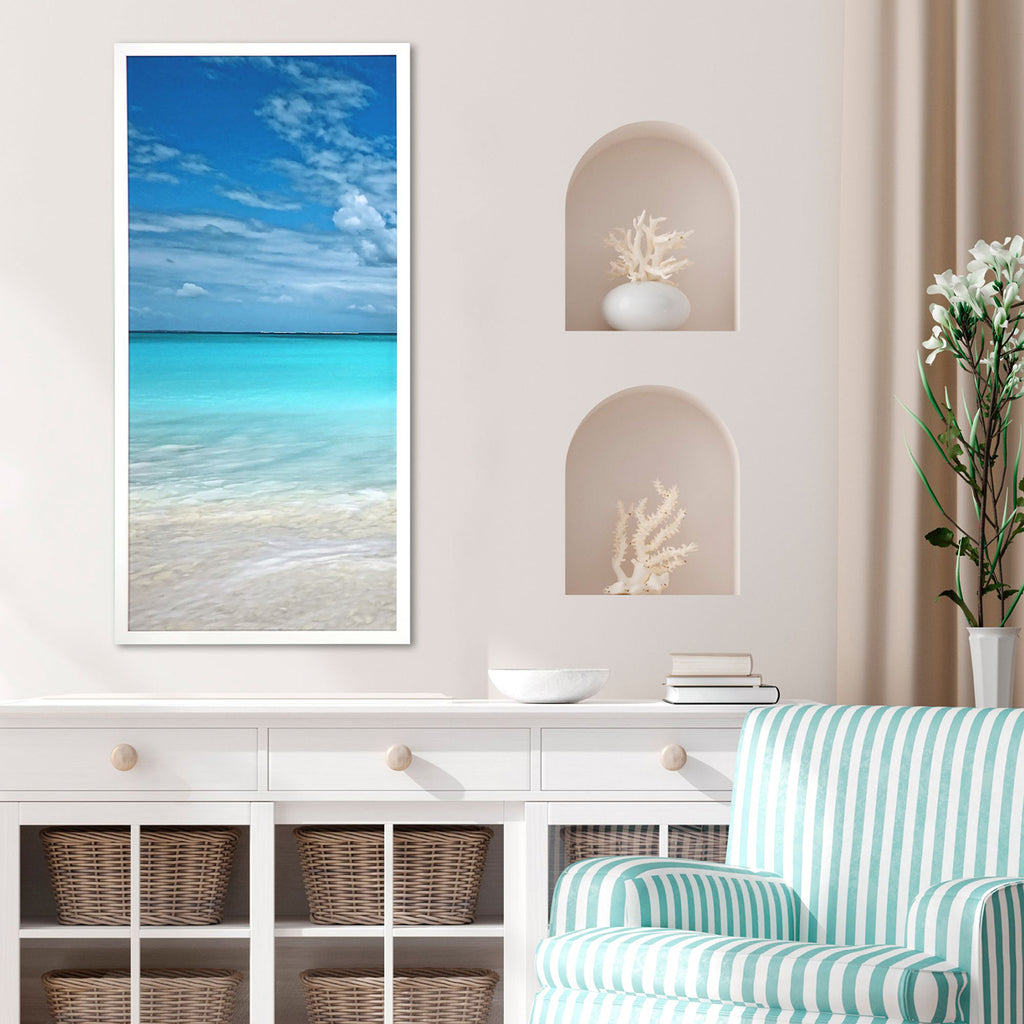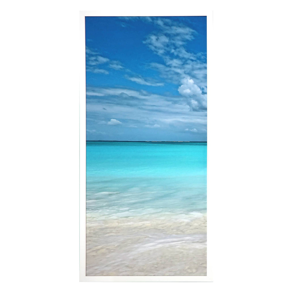 Beautiful day at the beach! A sandy beach contrasts against a luminous ocean of blue. Framed in a lacquered white wood shadow box style moulding.