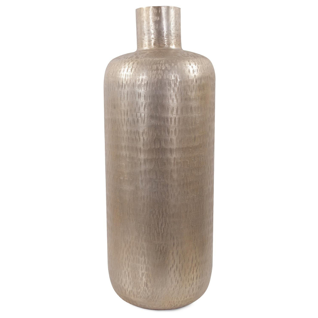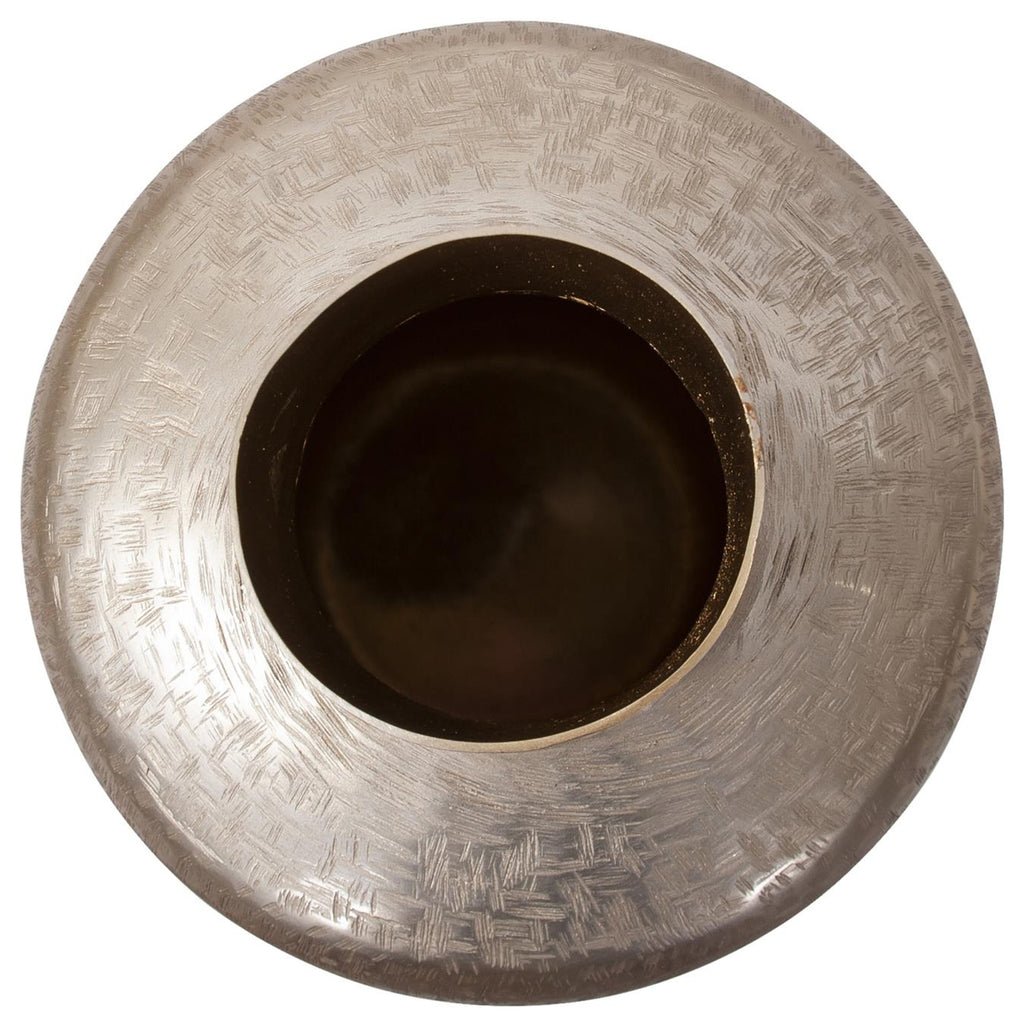 Beautifully forged and crafted by hand, the intricate etched crossway pattern helps to bring each shape to life with added dimension and texture. The short neck large bottle vase in a lustrous champagne finish makes a great accent piece all alone or filled with a few artificial sprigs to lighten up a room.