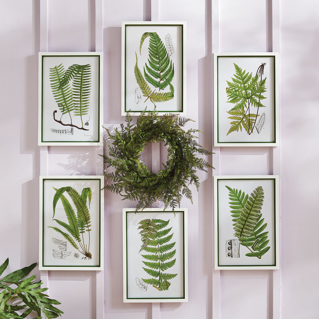 All fern lovers know that every fern variety is more intriguing than the next. This frond study highlights this fact and shows in illustrated detail just how diverse this lush plant really is. Finished off with a simple white and green frame, a bright pop of nature's beauty for hallway, study or bedroom.