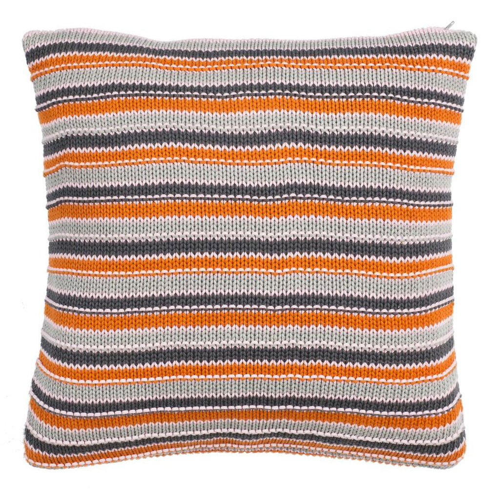 The knit throw pillow displays a playful design that works well in casual beach house and country-chic décor. Grey, pink and orange bands create a decor-smart juxtaposition of bright and casual hues. Soft cotton yarns complete the homey look of this comfortable throw pillow.
