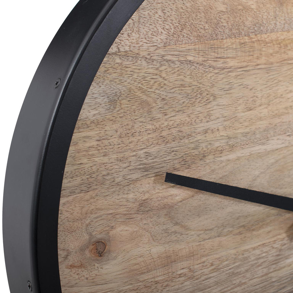 This unique timepiece features a matte black frame that encircles the clock face, providing a bold and contemporary backdrop. In the center, a rich wood-colored piece gracefully pierces through the frame, creating an intriguing visual contrast. The wood appears to float within the frame, adding warmth and organic beauty to the composition. With matching matte black hands that sweep across the clock face, this piece not only keeps you punctual but also serves as an artistic statement, inviting you to appreciate the harmonious marriage of materials and design.