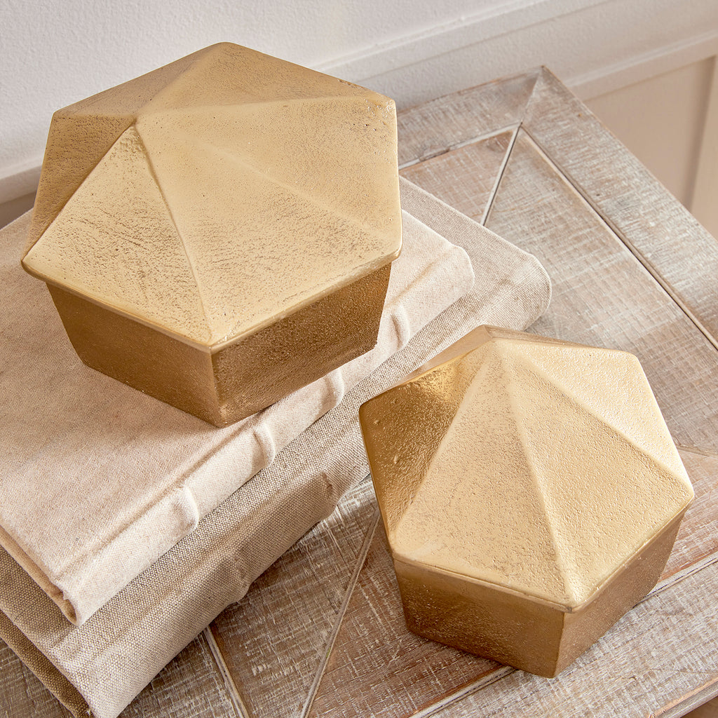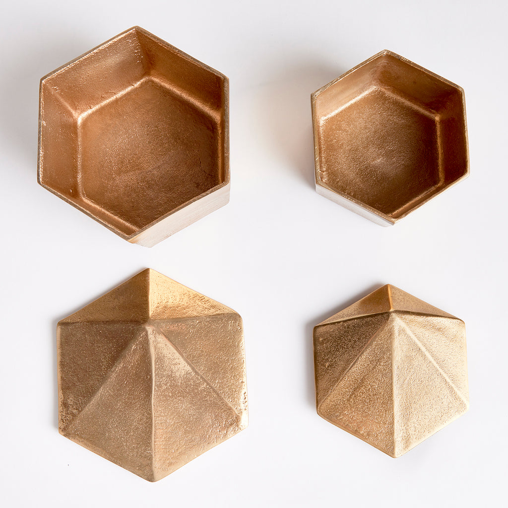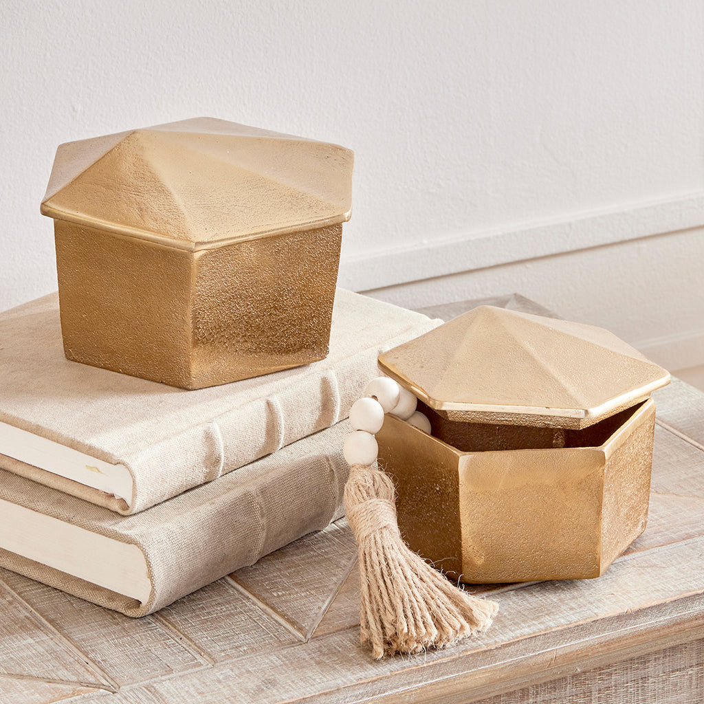 This set of lidded boxes is a bit off, by design. The lids are off pitch which makes for a unique and unusual look. Great for bookshelf, side table or on bedside table to hold jewelry, keys or loose change.