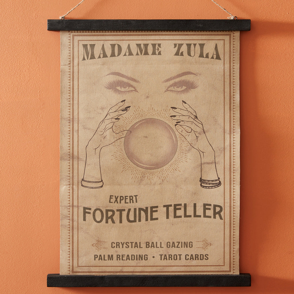 Crystal ball gazing, palm reading, and tarot cards too! Madame Zula can tell every part of your fortune or foes. This wall sign is a perfect display for Halloween decor.
