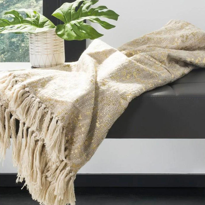 Gold highlights set against natural hues lend a touch of class to any sofa, loveseat, or accent chair, with fronds of must-touch fringe adding warmth and flowing dimension to any room decor.