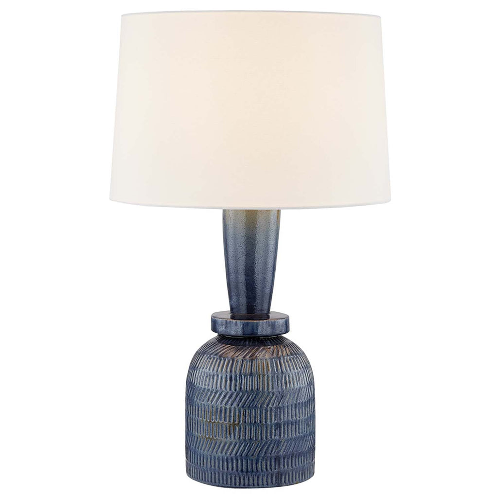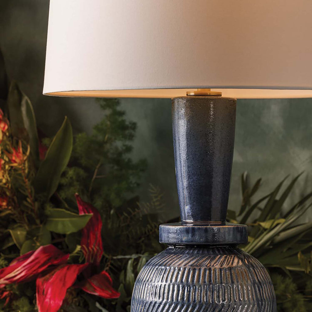 In both form and finish, Mitzi Russo provides a playful take on a ceramic table lamp. Its geometric silhouette is brought to life with a cobalt glaze that has been hand-etched with a textural marking pattern. A large white linen drum shade balances the artisanal base with unexpected proportions. Part of our Mandy Cheng collection.