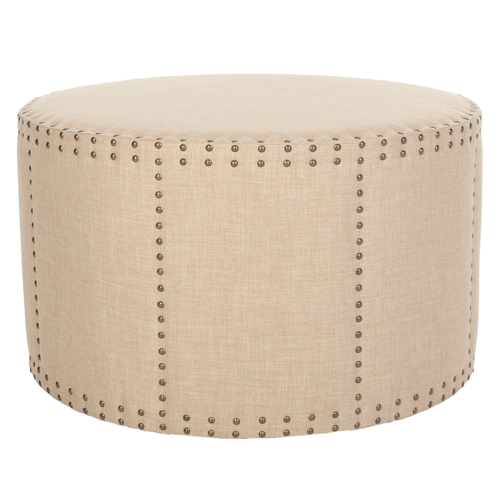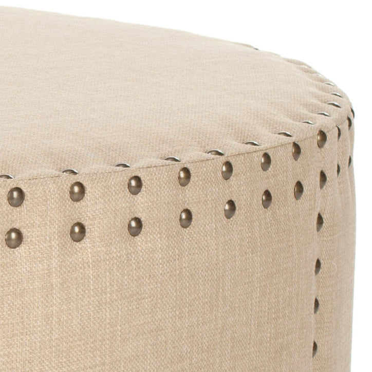 Brass nail head details infuse the round Manor ottoman with a hint of traditional masculine edge. Crisp linen blend fabric in beige softens the look of this handy stool, which offers a designer look, combined with functionality, and versatility.
