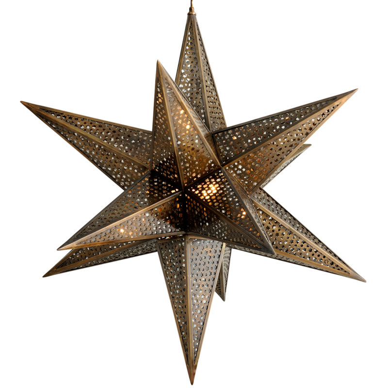 Putting a unique twist on the classic Moravian Star, the Martyn Lawrence Bullard Star Of The East chandelier perforates a body of Old World Bronze with different-sized stars and a matching canopy. Its sense of scale and history makes it an enchanting fixture with a mysterious aura.