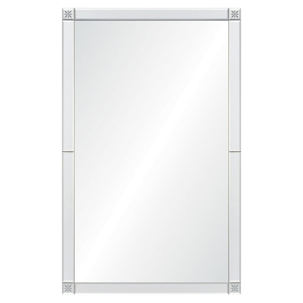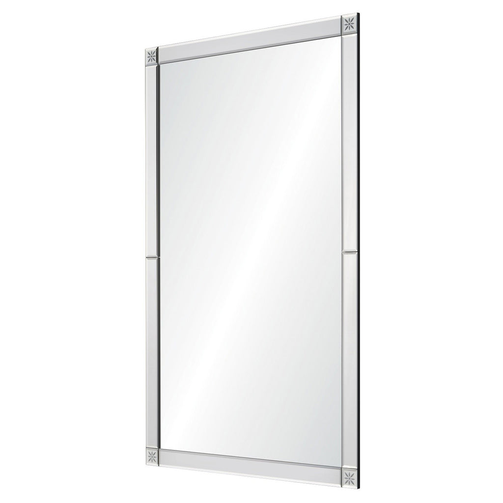 Mirror framed mirror with a non-beveled center mirror surrounded by hand cut mirror with etched stars. Wood backing in satin black finish. Cleat hanging hardware provided. Item can hang horizontally or vertically.