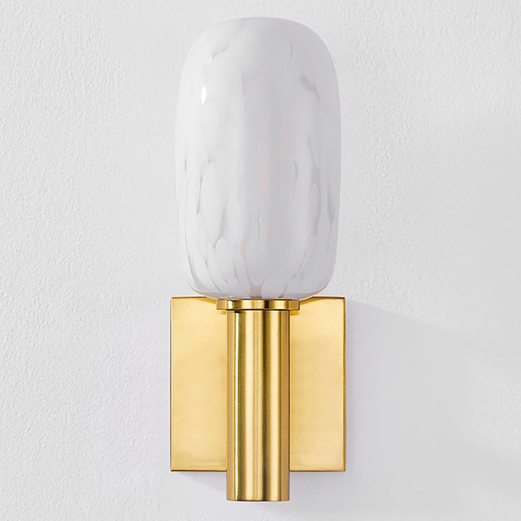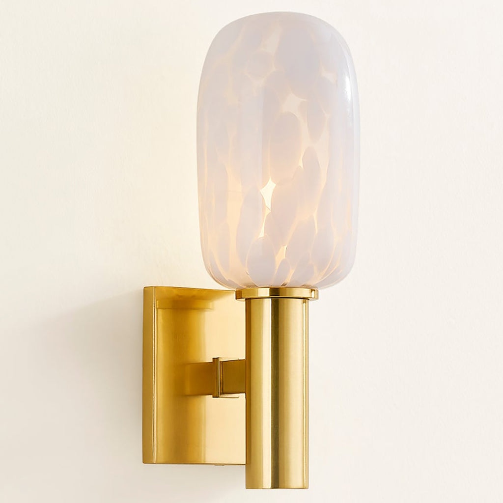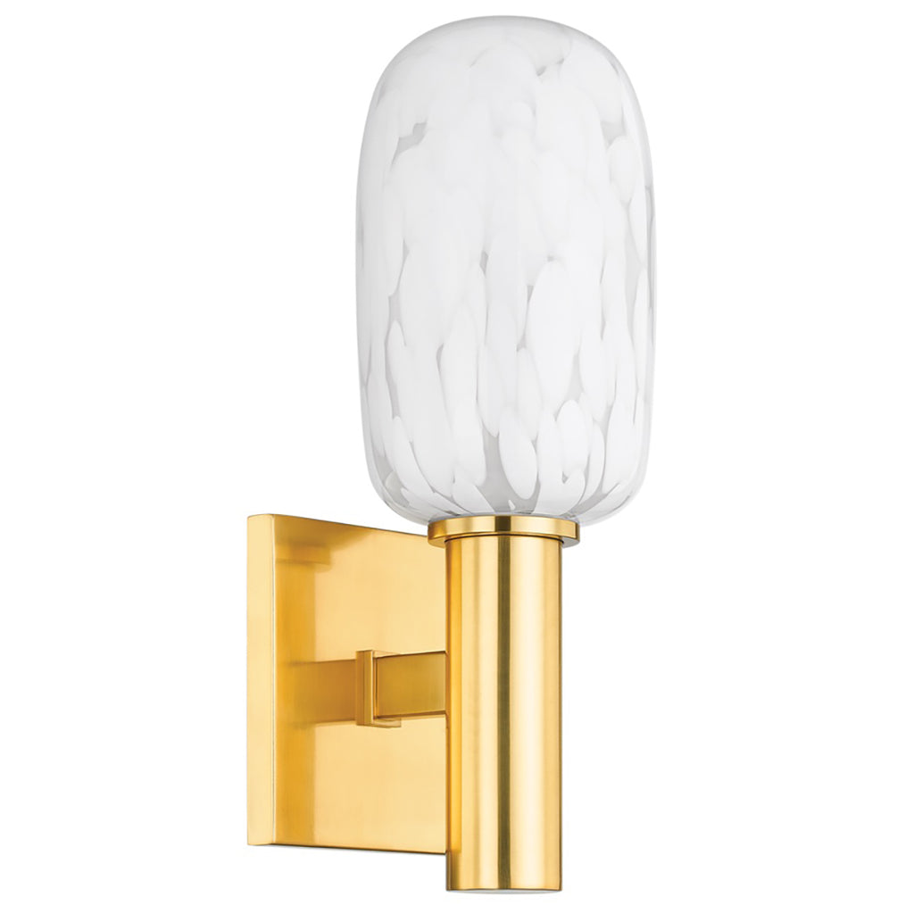 Even as a simple sconce, Mitzi Abina Wall Sconce makes an immediate statement with its whimsical silhouette and elevated materiality. The Nuage Glass shade features whimsical white speckles captured in clear glass that create a celebratory appearance. Finished in sleek Aged Brass, the backplate and post of  Mitzi Abina offer a moment of tailored clarity that balances the playful shade.