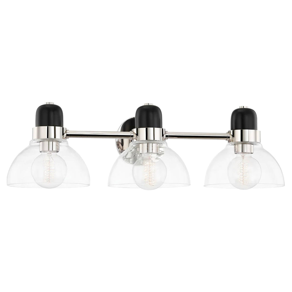 High-quality and exceedingly creative, Mitzi delivers a semi-nostalgic classic lighting collection with streamlined contemporary elements that instantly upgrade your space. From AM to PM, find your best light with vanity lights by Mitzi in your master bath or guest bathroom, serving daily inspiration with flawless form and function. A modern industrial muse, the Mitzi Camile 3-light bath bracket draws inspiration from the classic bistro light. Contemporary accents like the open, exaggerated shade allow light to flow freely, giving the piece a natural mystique. A soft black finish is accompanied by aged brass or polished nickel, providing a two-tone effect that is offset by hand-blown glass.