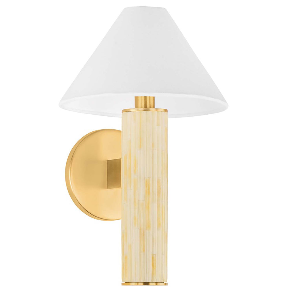 Pulling reference from Italian modernist interiors, the Mitzi Clover sconce enhances minimalist geometry with a fluted bone inlay. The column-like base nods to classic antiquities, as does the glimmer of Aged Brass at the neck. A simple yet refined conical linen shade allows the craftsmanship of the intricate inlay to shine.