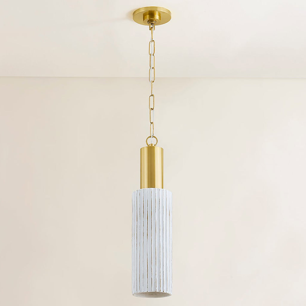 Treading the line between classic architecture and contemporary minimalism, Mitzi Corissa Pendant features a cylindrical body reminiscent of a Roman column. Crafted from fluted Whitewashed Bisque, the fixture is balanced by a flawless Aged Brass cap and chain. Whether as a pendant light or flush mount, Corissa's silhouette exudes depth and character, making a chic statement in hallways and kitchens.