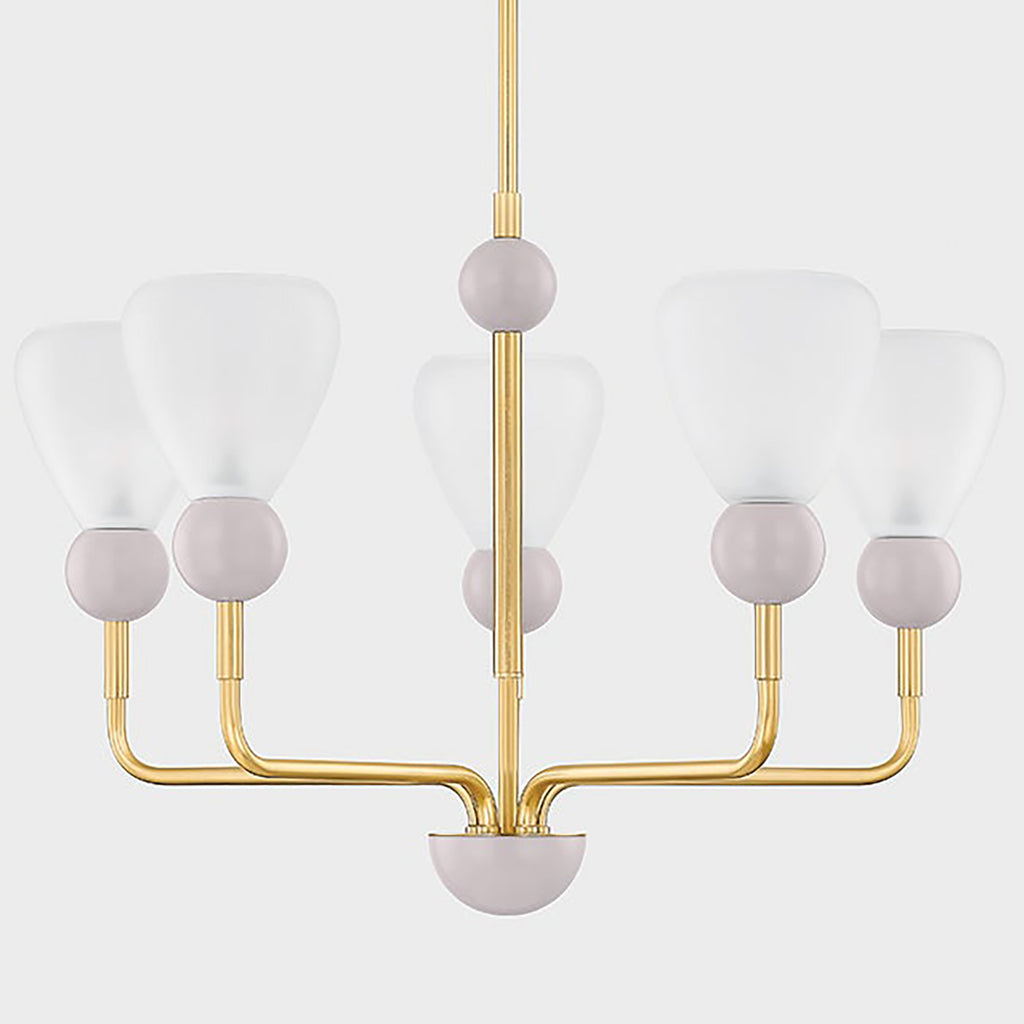 Treading the line between art and design, Mitzi Doreen Chandelier combines sleek Aged Brass metalwork with whimsical details. Conical shades cast from etched matte glass diffuse light over a large area while serving as a focal point. Painted peignoir ball details lend a playful charm to this enchanting wall sconce and chandelier.