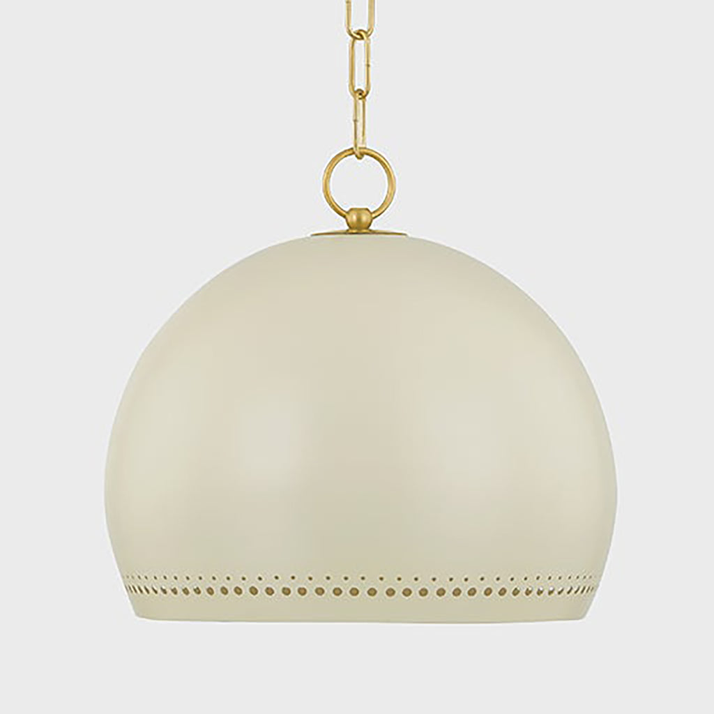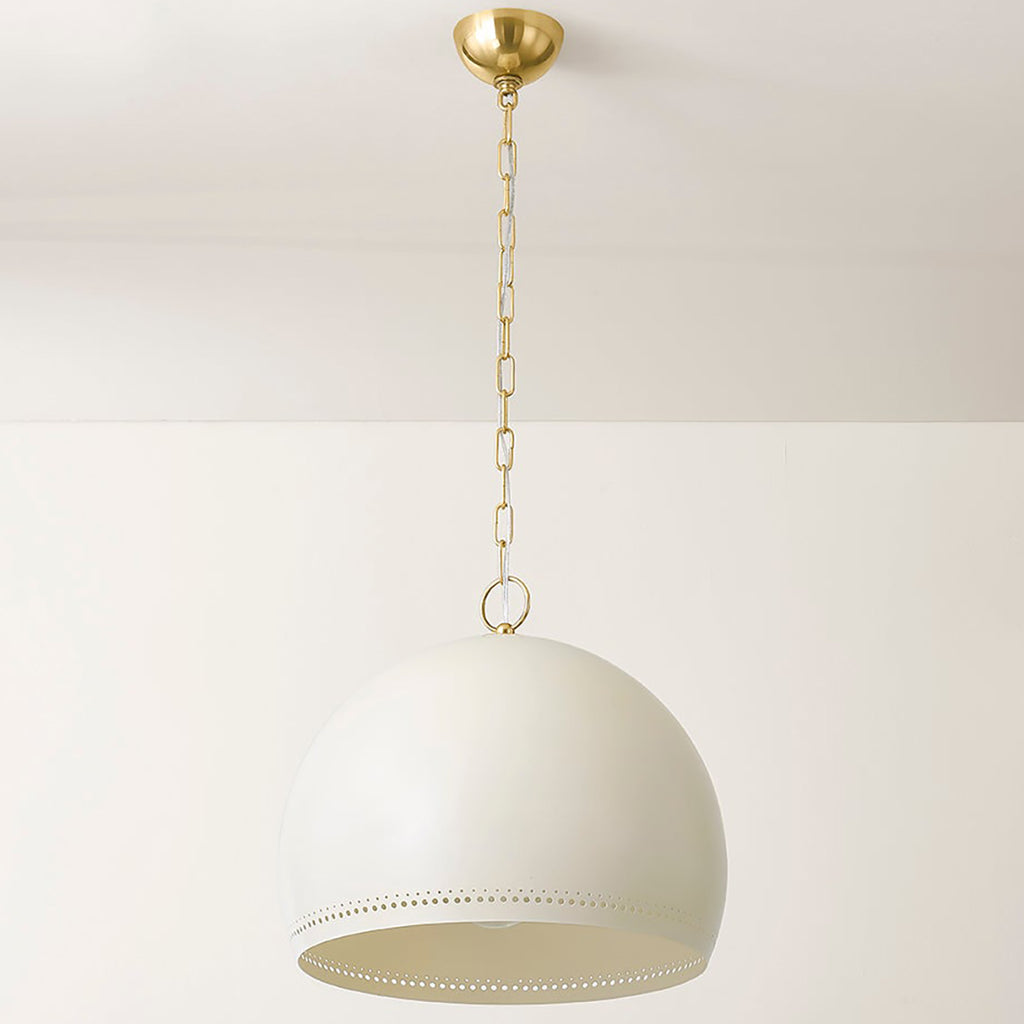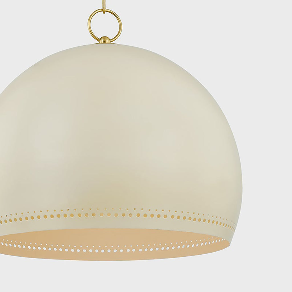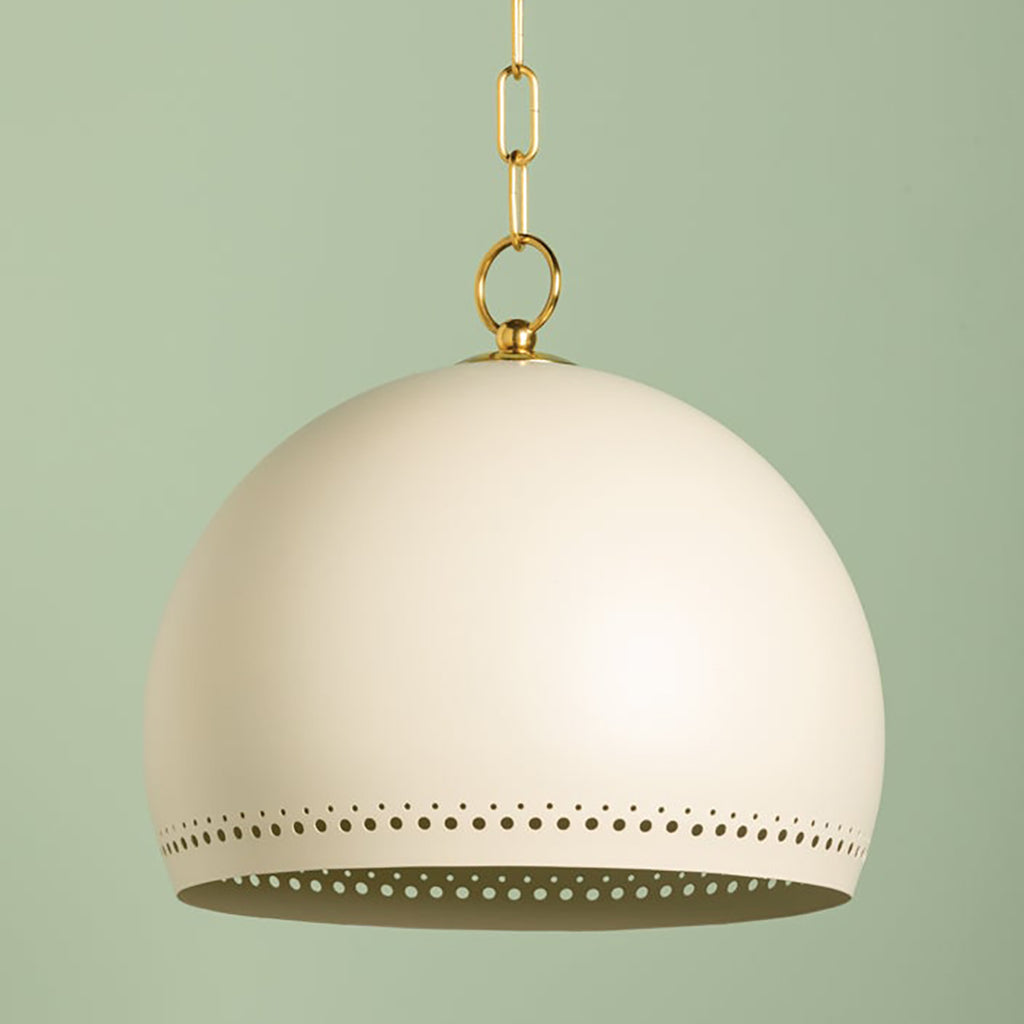 The simple silhouette of Mitzi Etna Pendant is punctuated by design details that create an elevated, chic lighting experience. A glossy Soft Cream hue is painted on the shade and emanates a warm glow from within. Delicate circular perforations allow light to filter through, casting unique shadows that play across the walls of the room. Available in two sizes, Etna will light up a kitchen, breakfast nook, or other desired area.